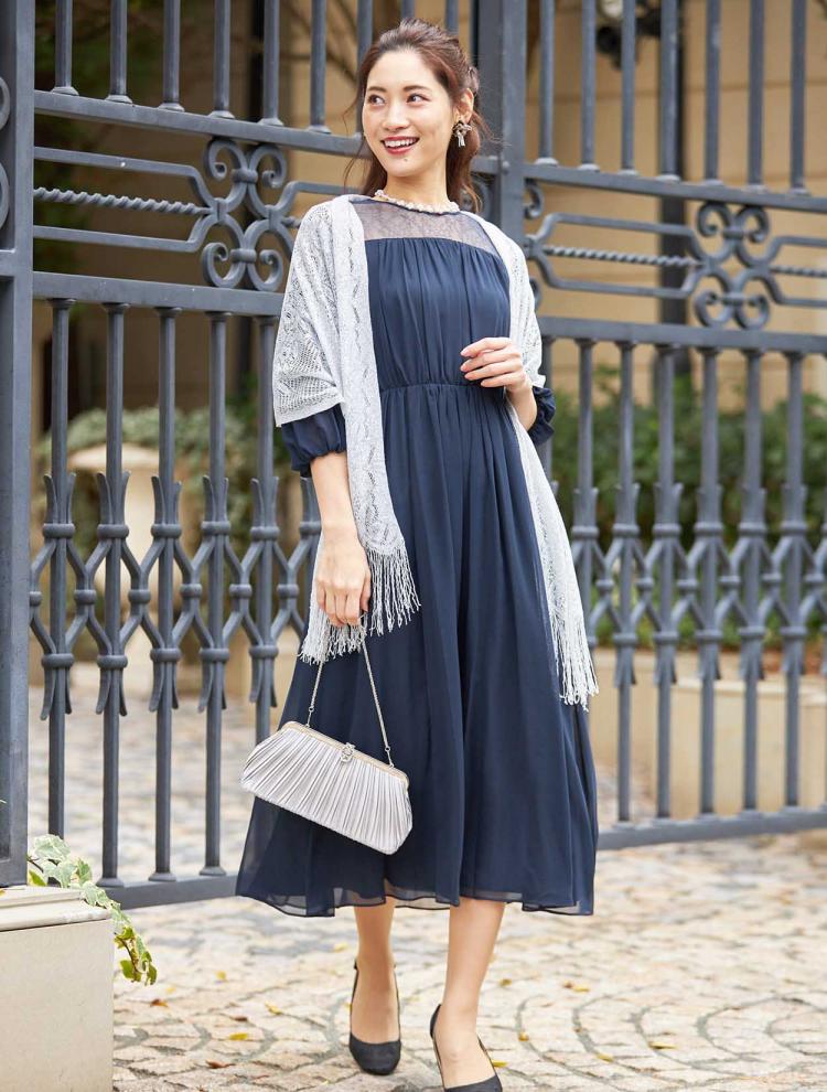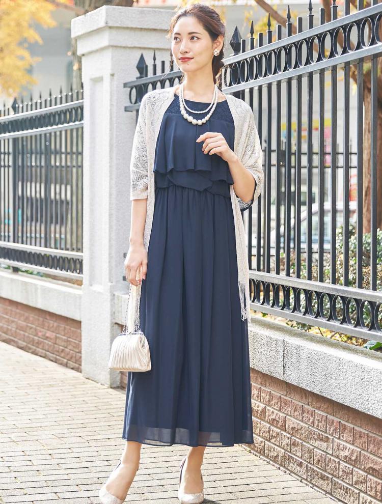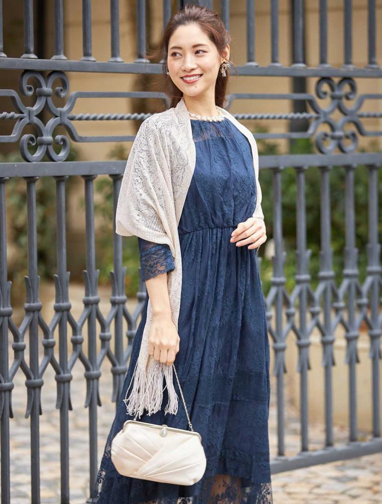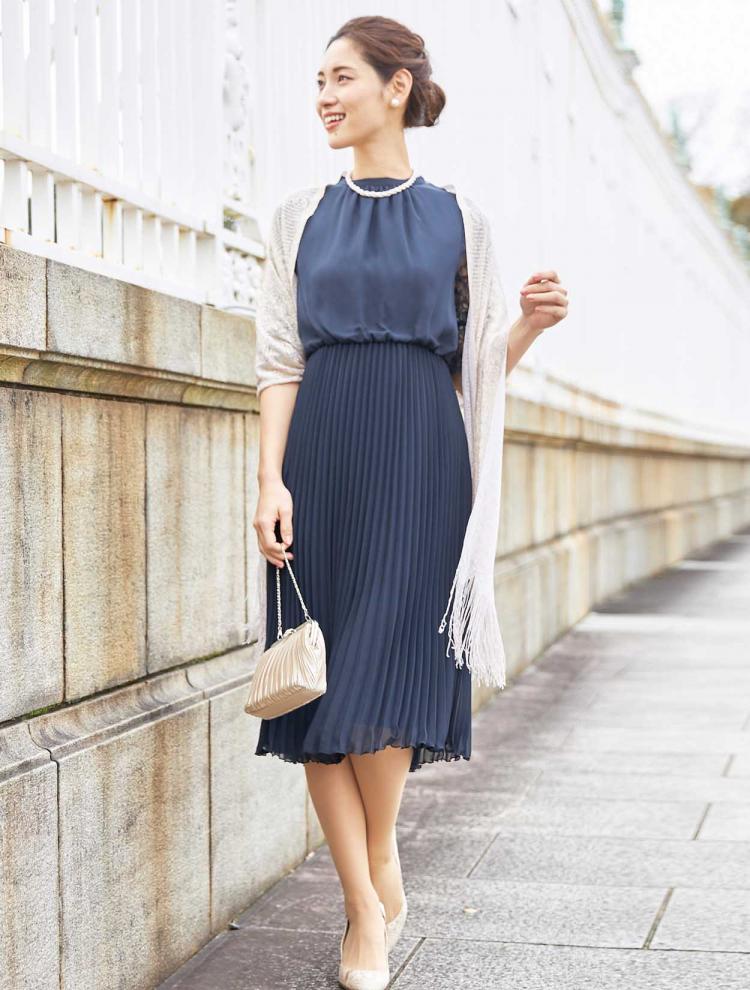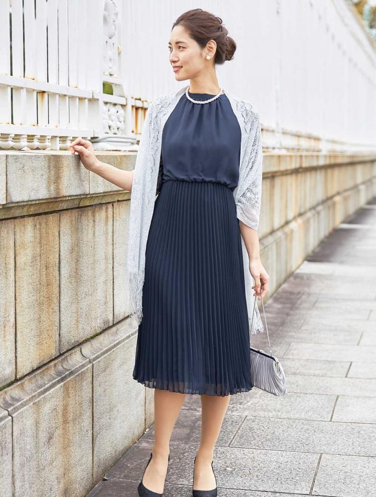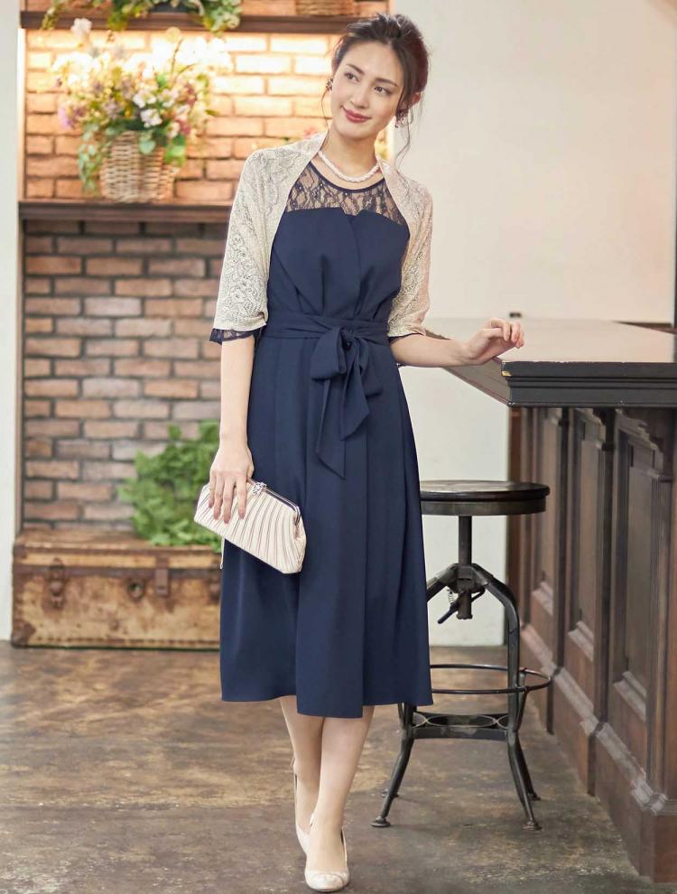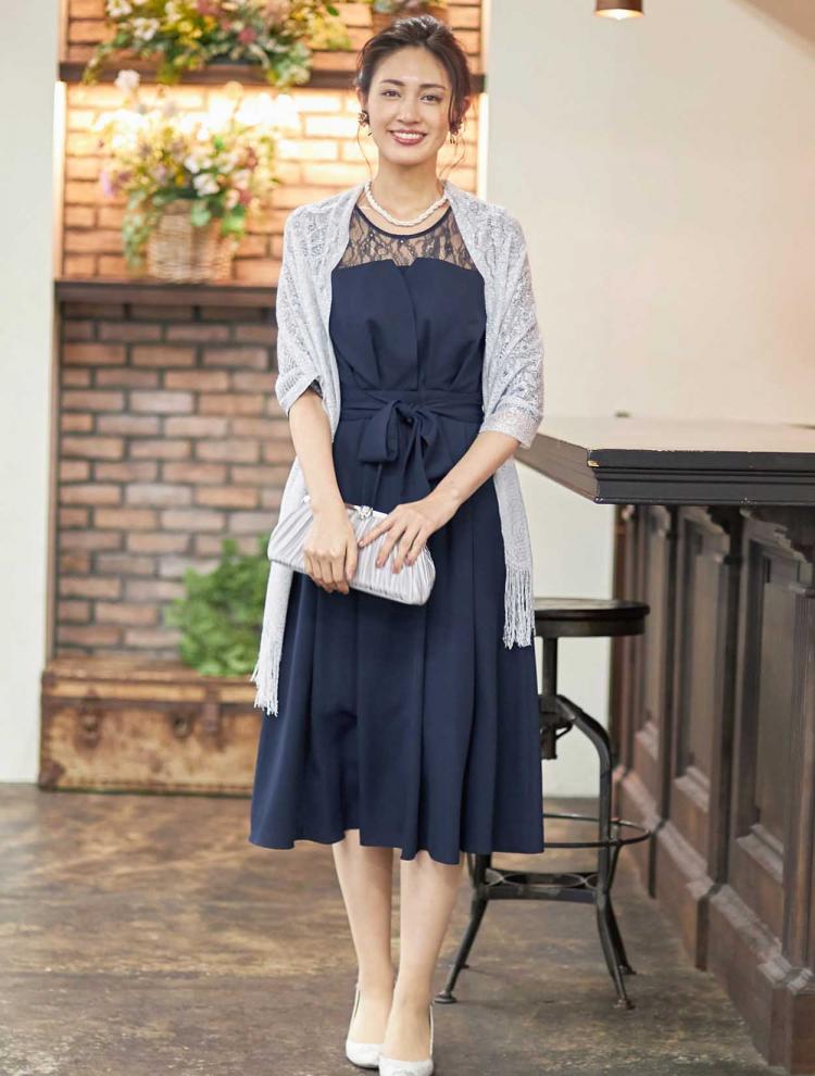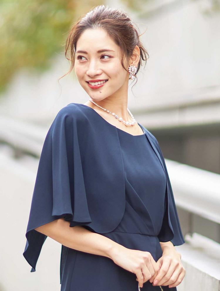 着る方の年齢を選ばないネイビーのドレスは40代・50代の方にもおすすめです。