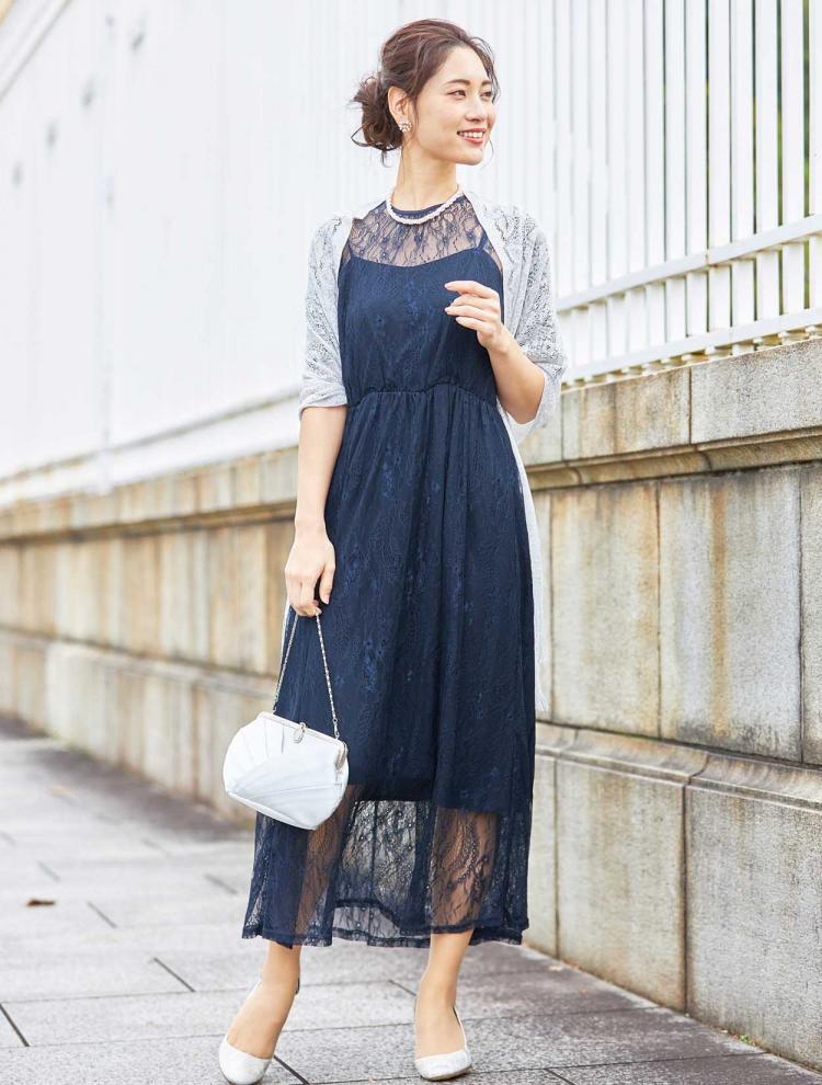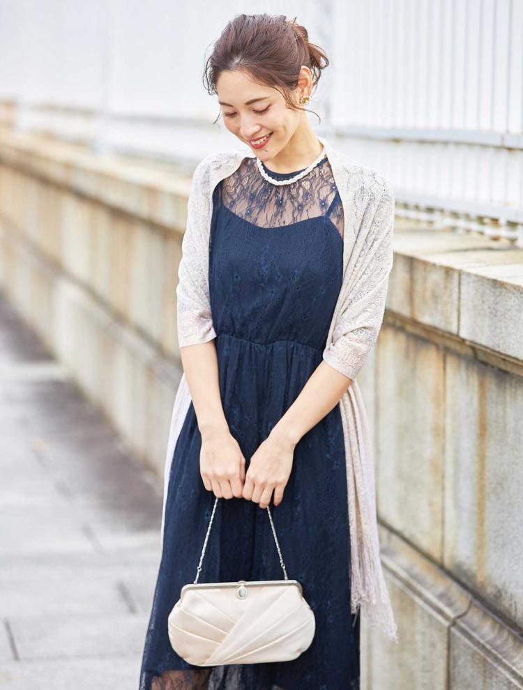 ただし、ネイビーのドレスを結婚式で着用する際は、全体の雰囲気が地味に見えてしまったり、他の方と被って見られてしまう可能性もある為、ネックレスや小物はパールやラメ感のある華やかな物を選ぶと晴れの日にぴったりのコーディネートとなります。また、レース素材のドレスを選べば、それだけでも女性らしい上品な印象を与えることができます。