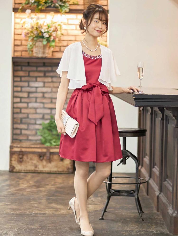 20代は華やかな赤ドレスがぴったりな年代。膝丈なら若々しく、ミモレ丈なら大人っぽく着こなせます。20代らしい清楚な雰囲気のコーディネートならベージュの小物や羽織を合わせるのがおすすめです。