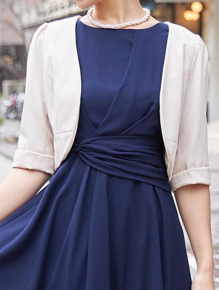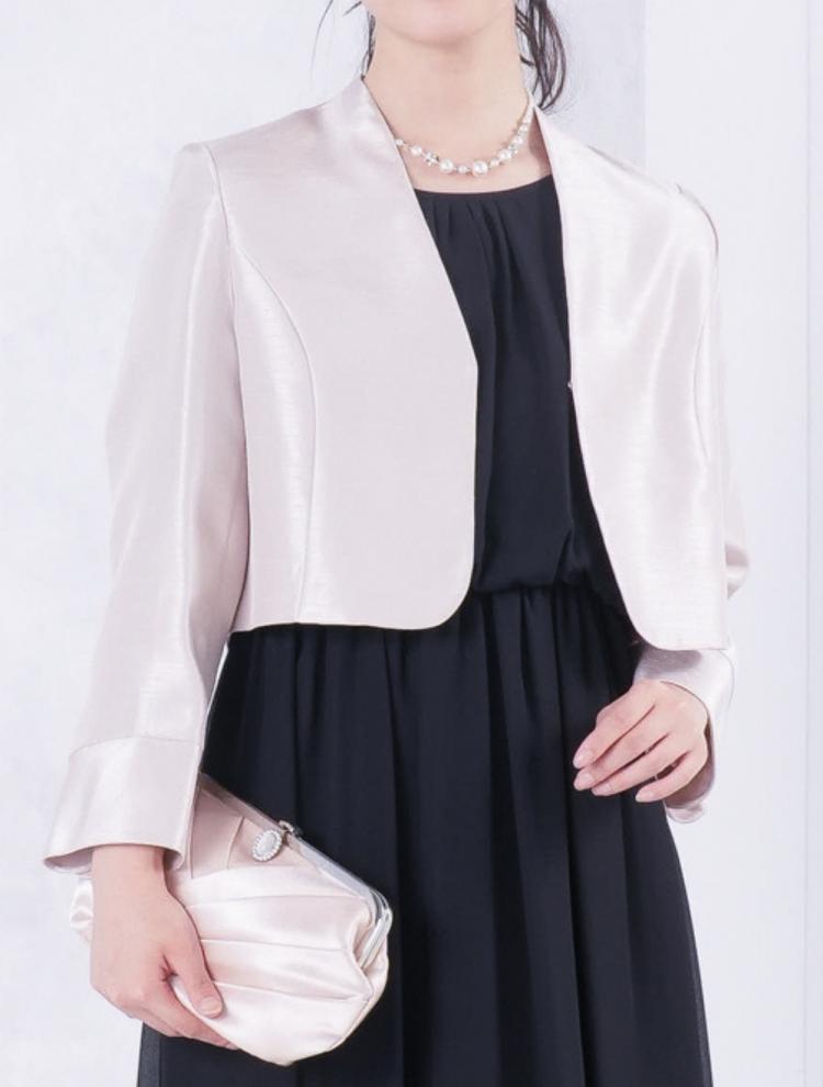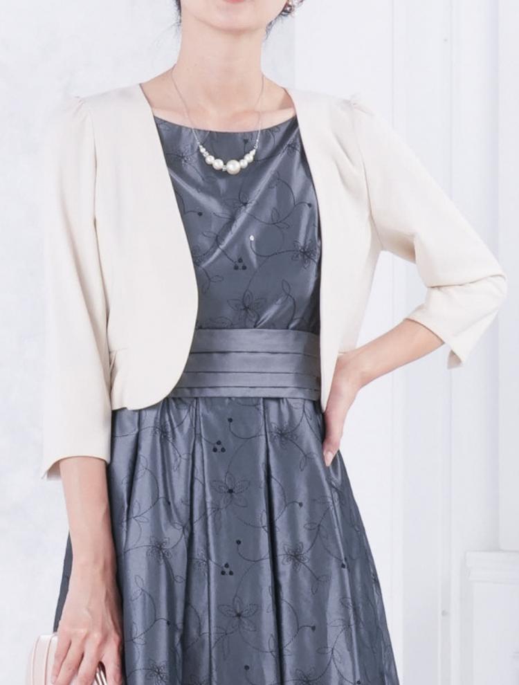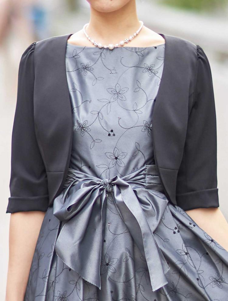 ボレロは着丈が短めなので、羽織ると後姿がスッキリ脚長に見えるのも嬉しいポイント。また、しっかり袖を通せて着崩れの心配がないので、ノースリーブドレスで受付やスピーチなど任されている方にはおすすめの羽織です。