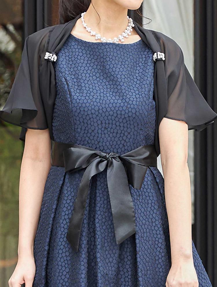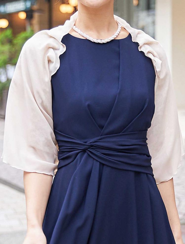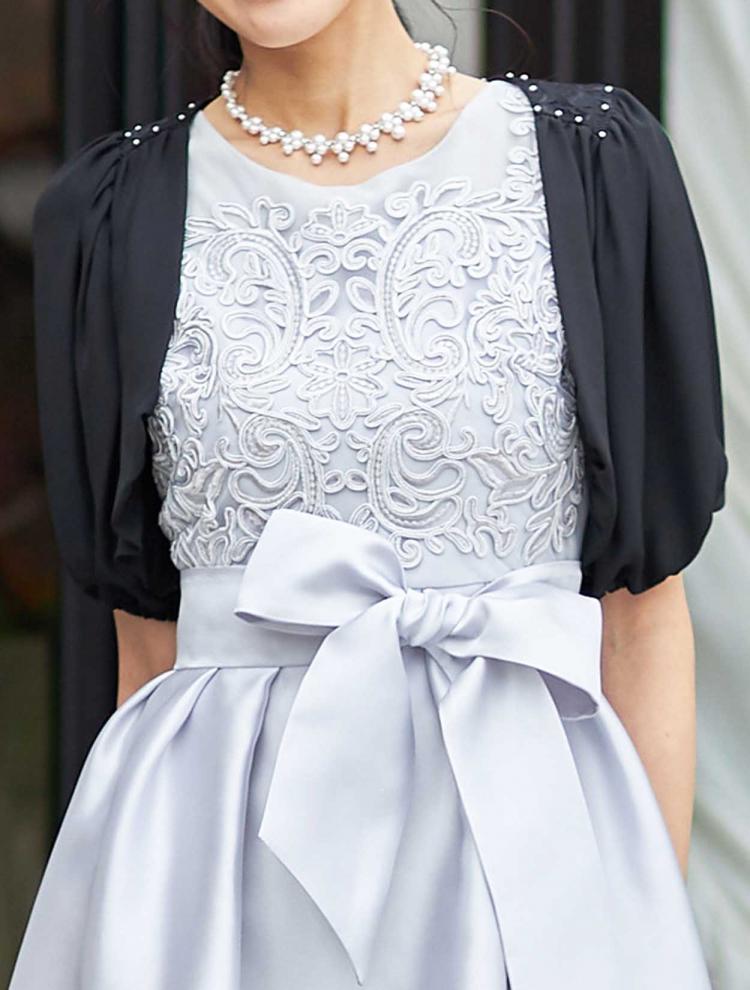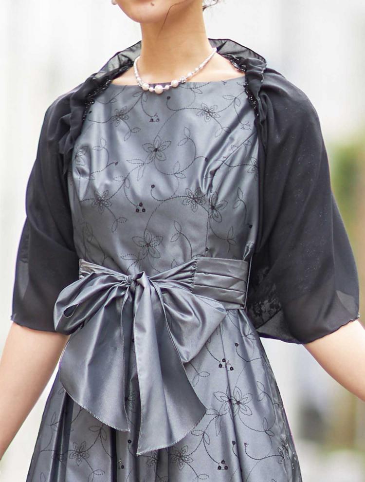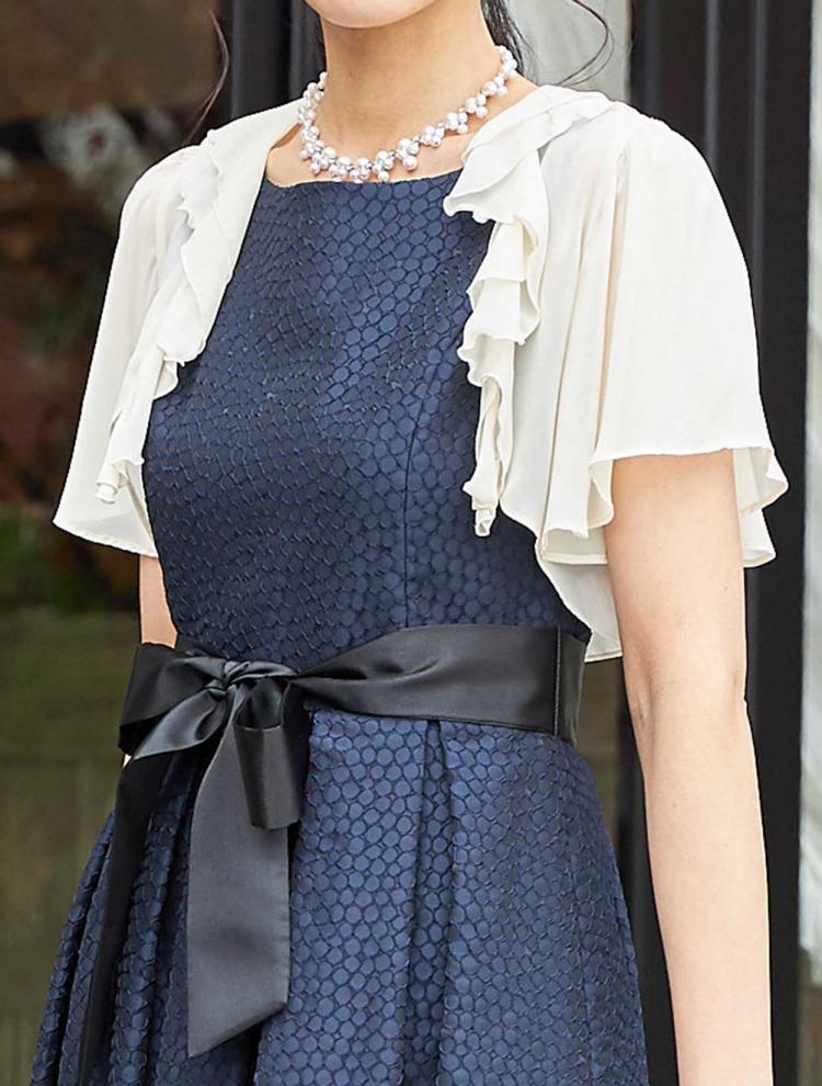 ボレロは着丈が短めなので、羽織ると後姿がスッキリ脚長に見えるのも嬉しいポイント。また、しっかり袖を通せて着崩れの心配がないので、ノースリーブドレスで受付やスピーチなど任されている方にはおすすめの羽織です。