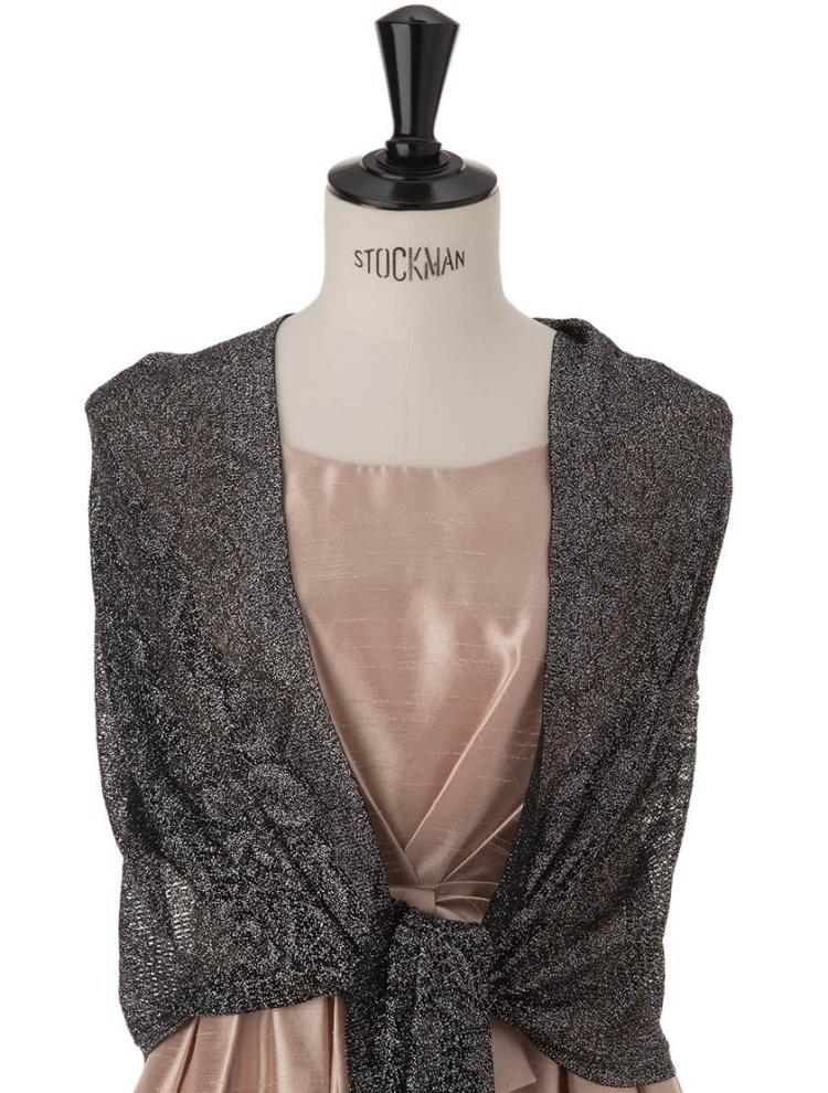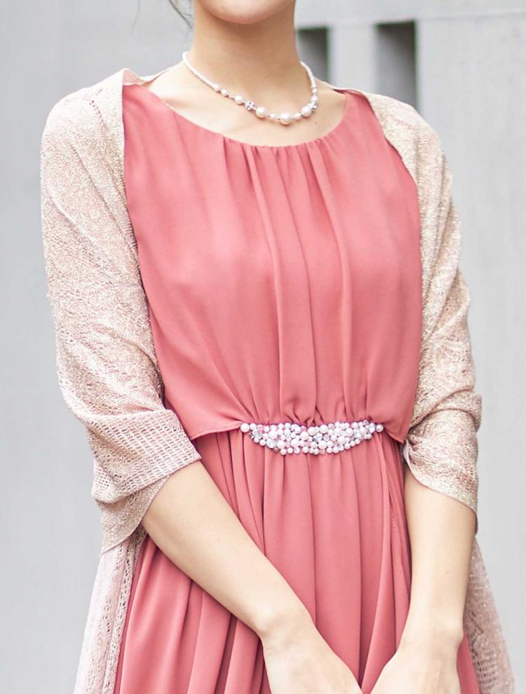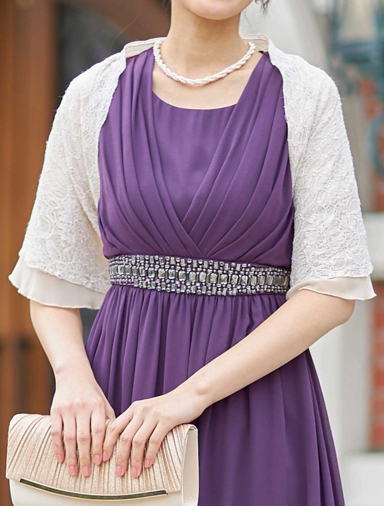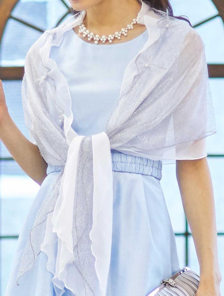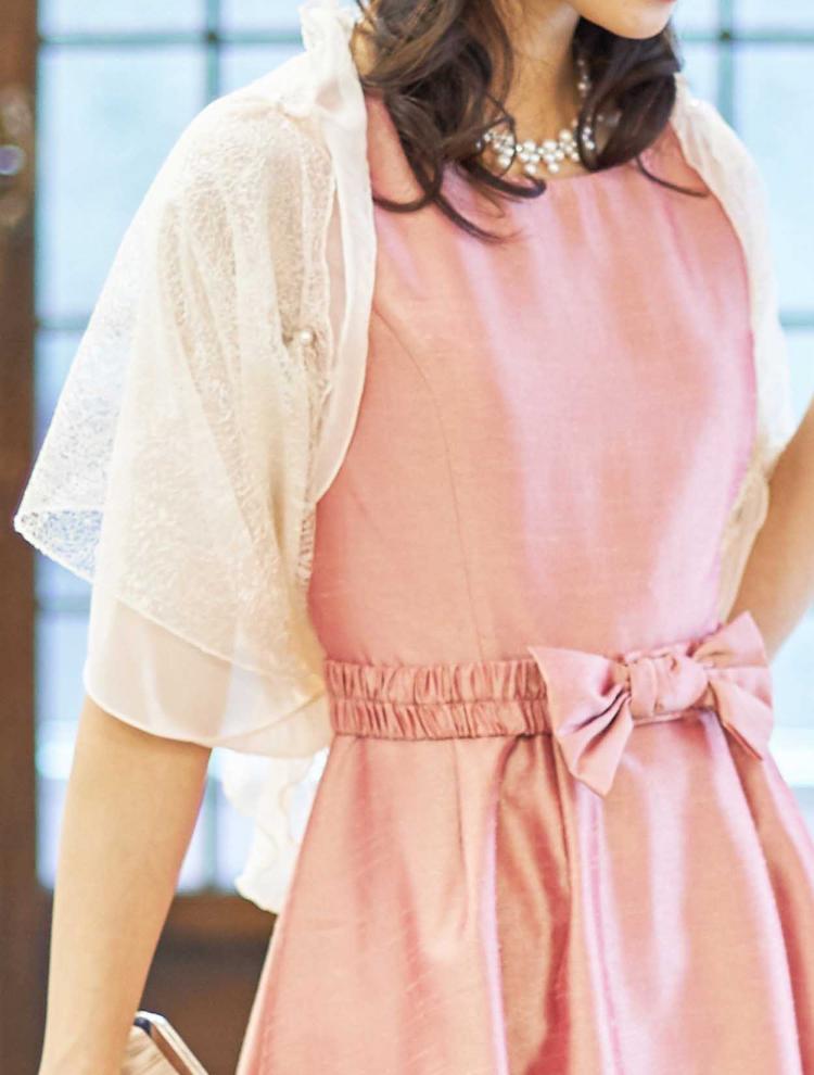 ラメが入った素材のショールはパーティー感もあって華やかな印象になります。レースやオーガンジーの素材のショールは、華やかな中にも上品な印象でご親族にもおすすめです。肩からサッと羽織るだけのショール、慣れれば上手に着こなせますが着崩れが心配な方には、袖通し付きのショールもあるのでそちらがおすすめ。肩から掛けるだけのタイプのショールは、ショールの先を前で結んだり後ろで結んだりすると安定感が出ます。袖付きのドレスに羽織を使いたい場合は、サッと羽織れるショールがおすすめです。