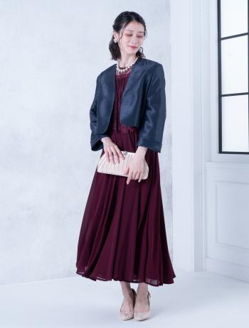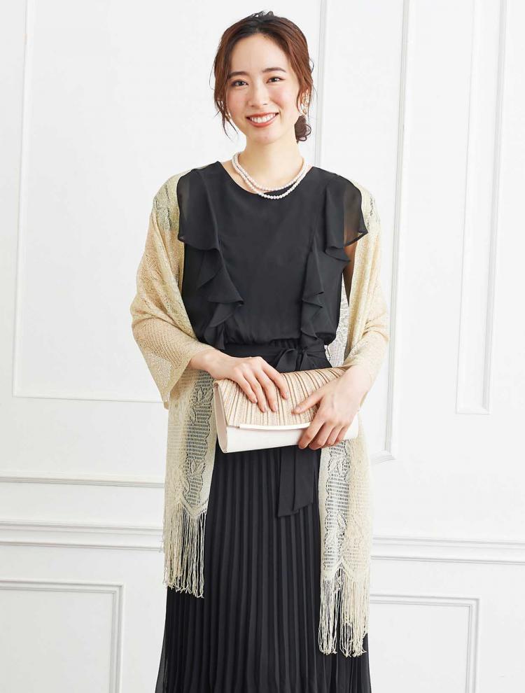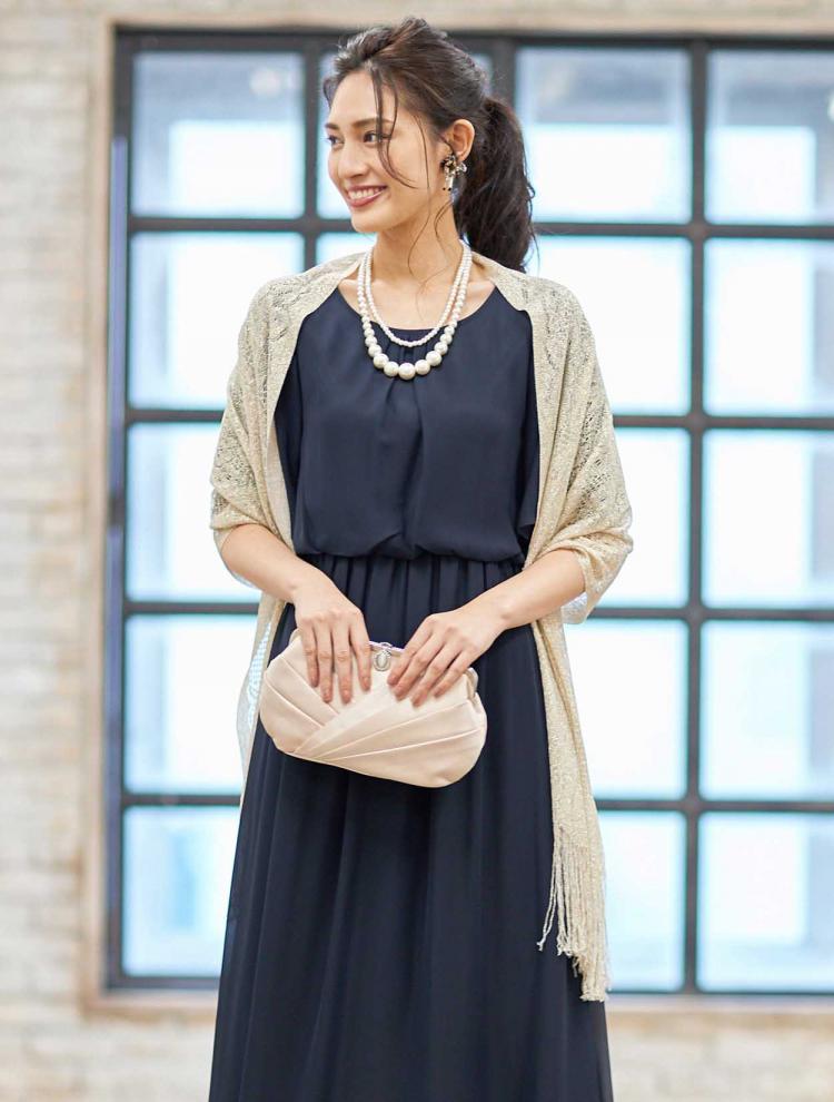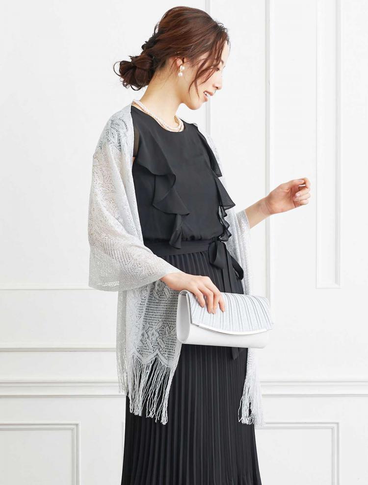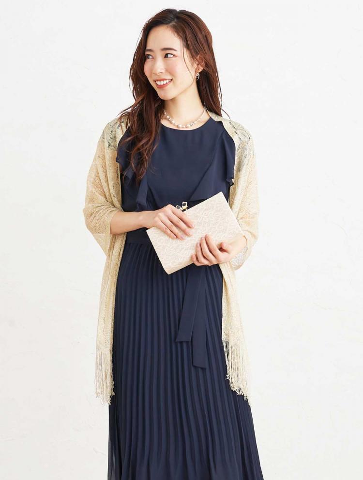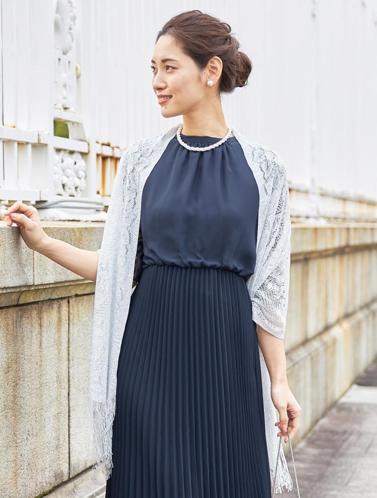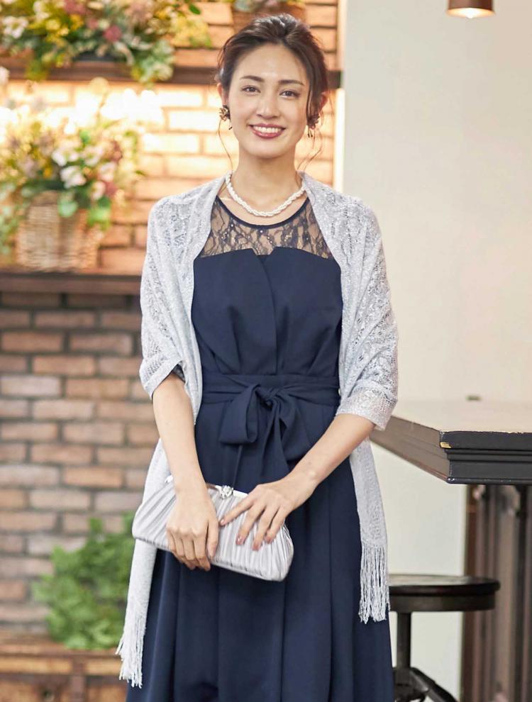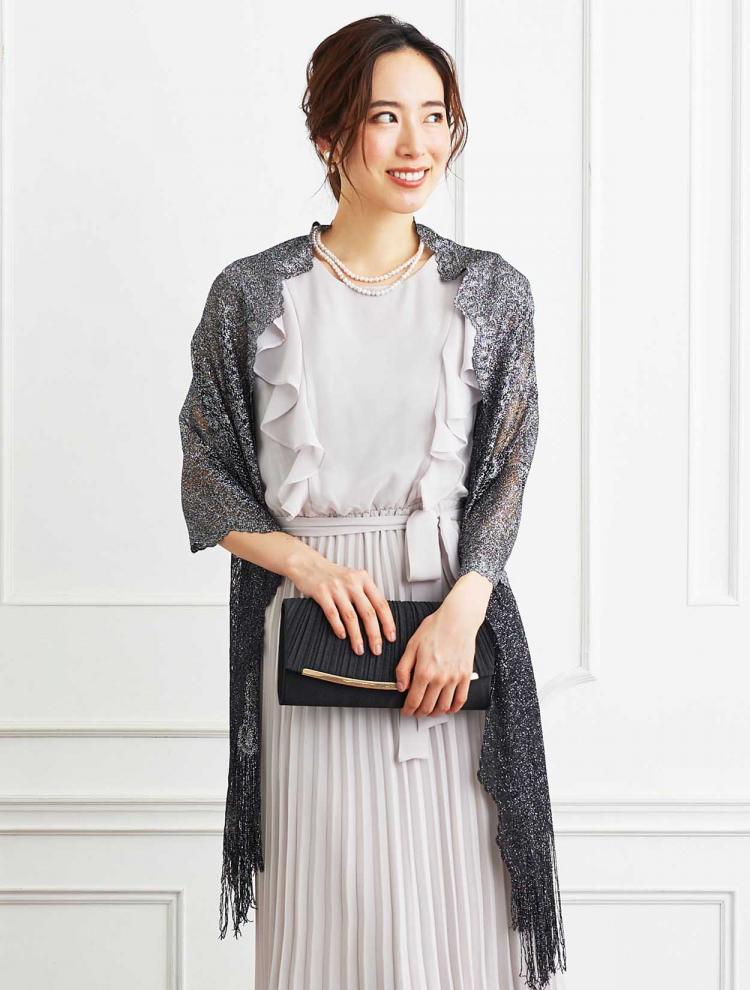 昨今のパーティードレスは羽織要らずの袖付きドレスが人気ですが、袖が無いドレスや袖付きドレスであっても露出が気になる場合は、ボレロやストール等を羽織る様にしましょう。また、ネイビーやブラックなど落ち着いた色味のドレスに華やかなさをプラスしたい場合にはラメ感や透け感のあるストールを羽織るだけで、一気に華やかなコーディネートになります。親族や会社の上司としてきちんと感のあるコーディネートで参加される場合は、ジャケットを合わせるとカッチリとした印象に。