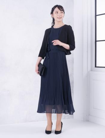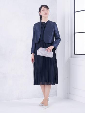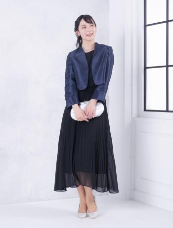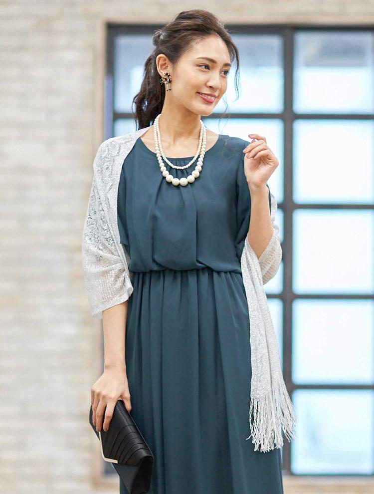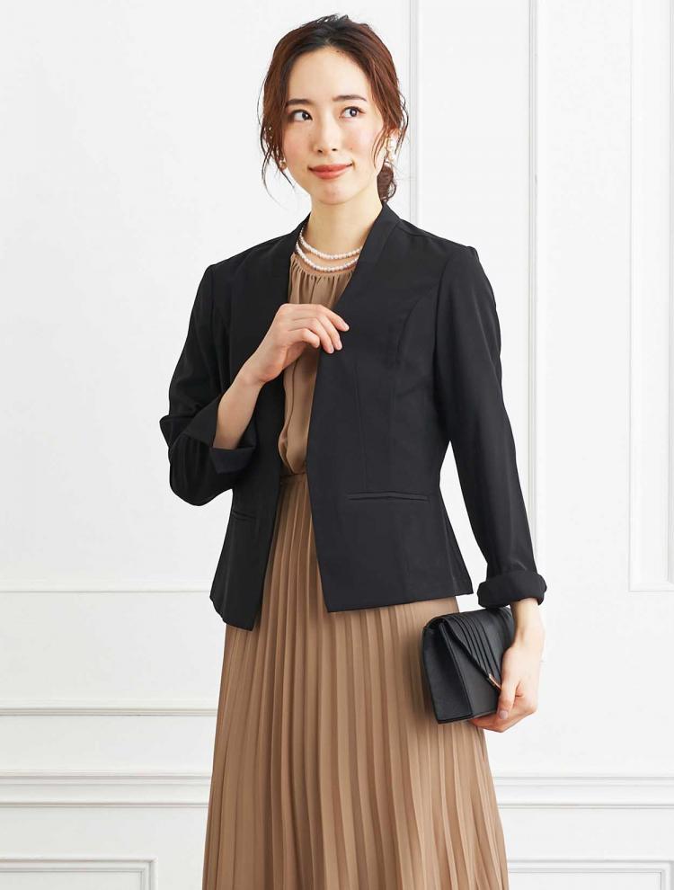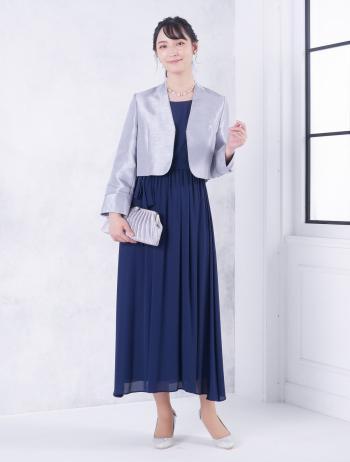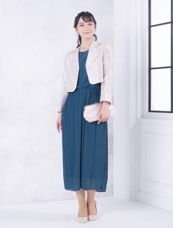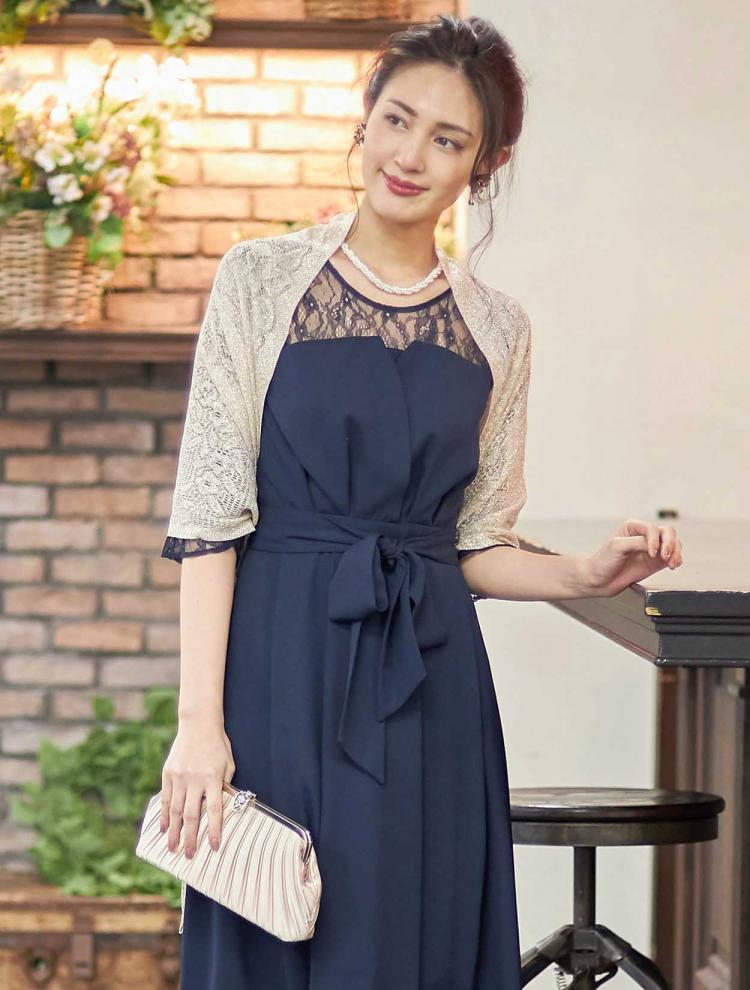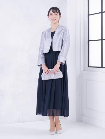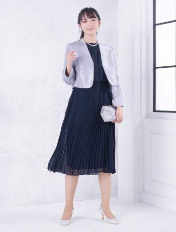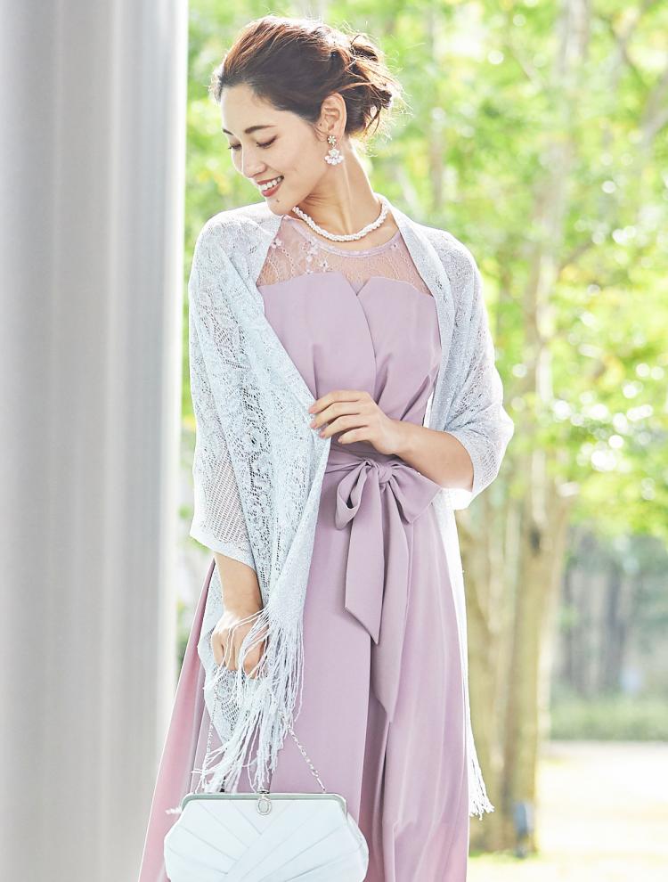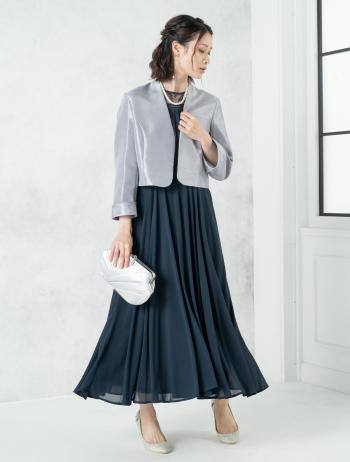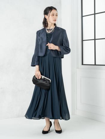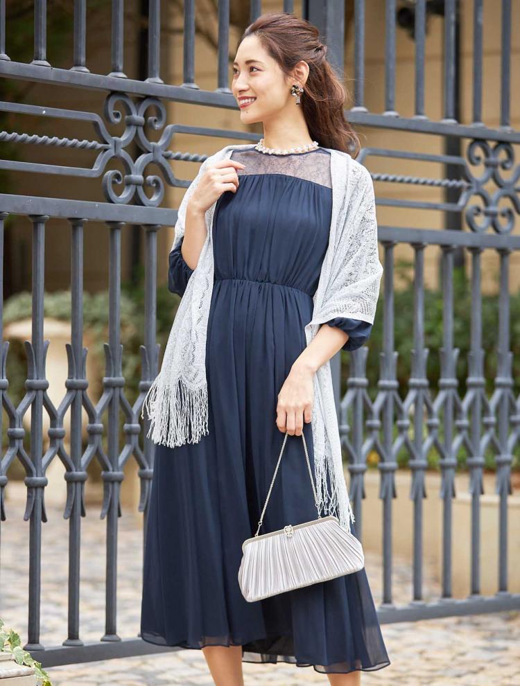 昨今のパーティードレスは羽織要らずの袖付きドレスが人気ですが、袖が無いドレスや袖付きドレスであっても露出が気になる場合は、ボレロやストール等を羽織る様にしましょう。また、ネイビーやブラックなど落ち着いた色味のドレスに華やかなさをプラスしたい場合にはラメ感や透け感のあるストールを羽織るだけで、一気に華やかなコーディネートになります。親族や会社の上司としてきちんと感のあるコーディネートで参加される場合は、ジャケットを合わせるとカッチリとした印象に。