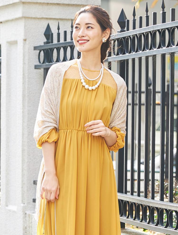人気の高い袖ありデザインのドレスの場合には、羽織物は用意せずにOK!トレンドのレースやシフォン素材の袖付きドレスなら、長めの袖丈でも重たくならずフェミニンに着こなせます。