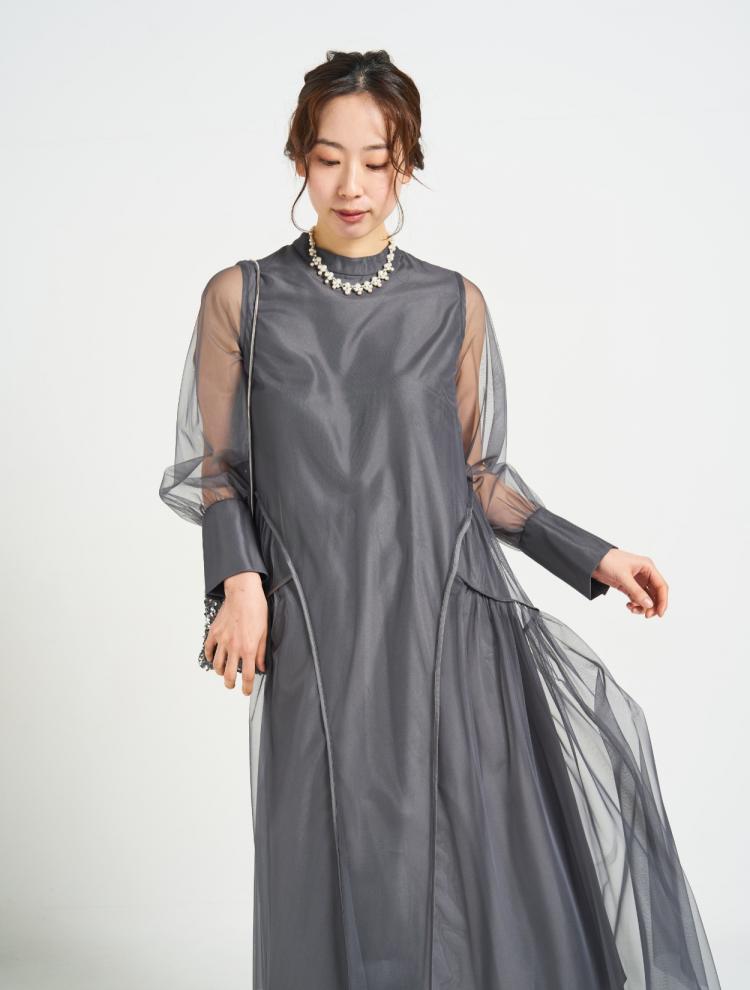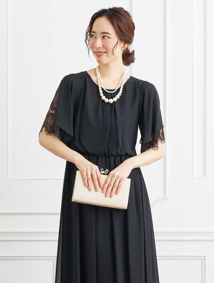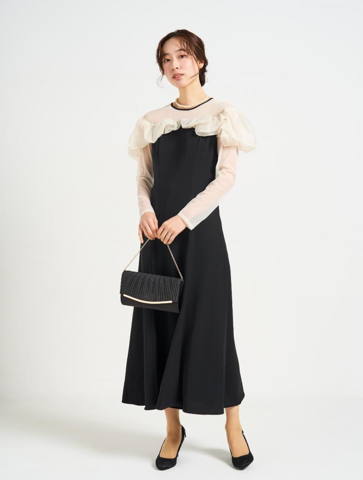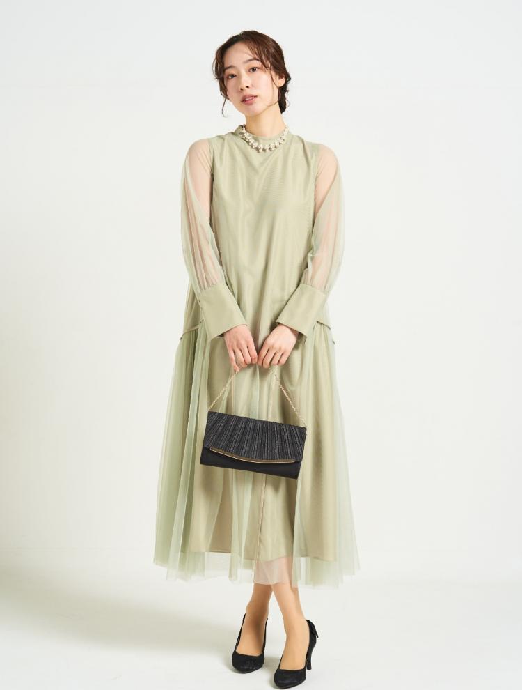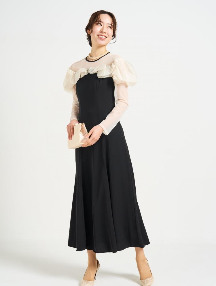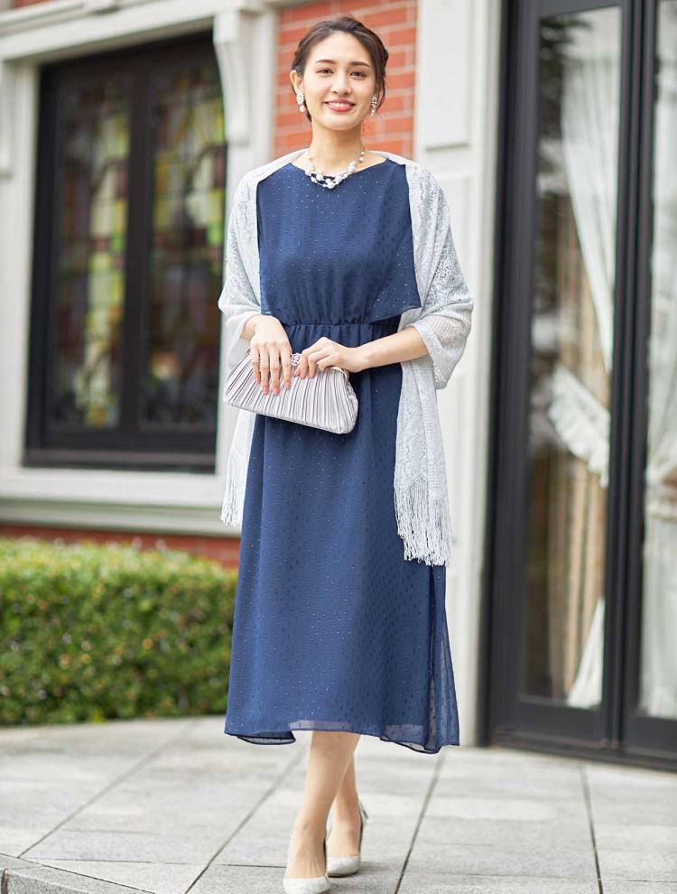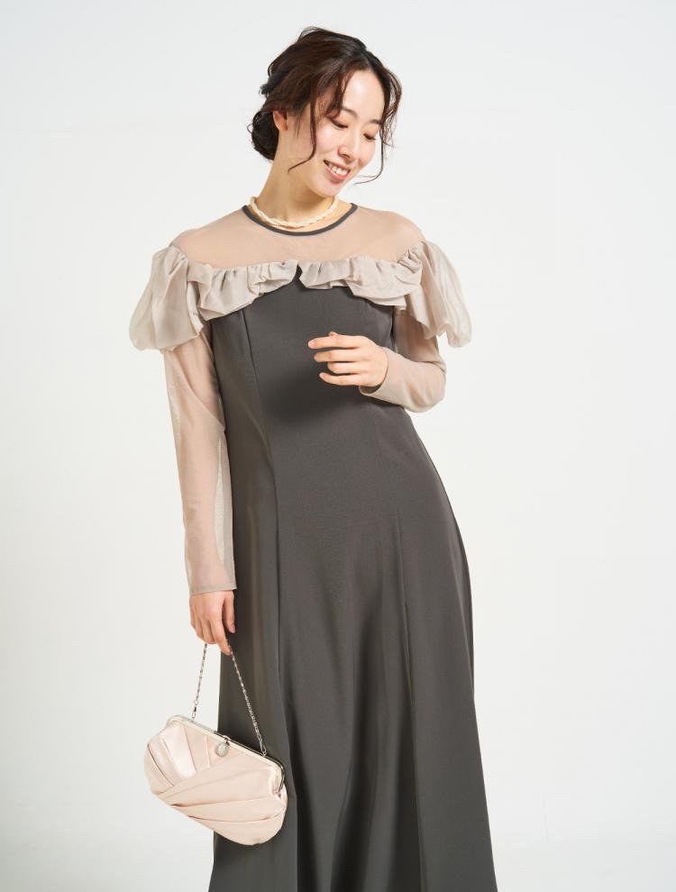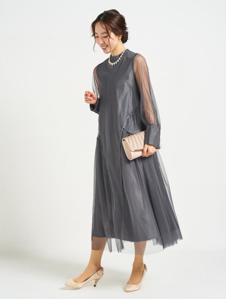 ウエストの位置が高めのドレスや、レースアップ等でサイズ調整ができるドレスだと、すっきりとしたシルエットに見えながら、着心地も安心です。また、ロング丈のドレスも足元の冷え対策におすすめです。