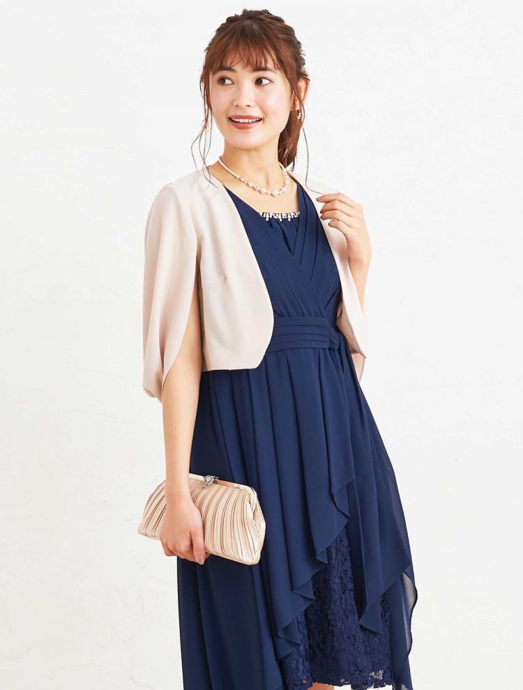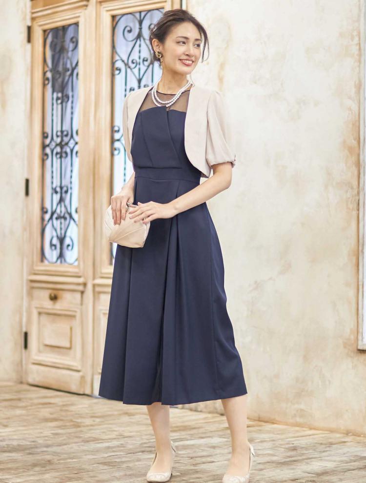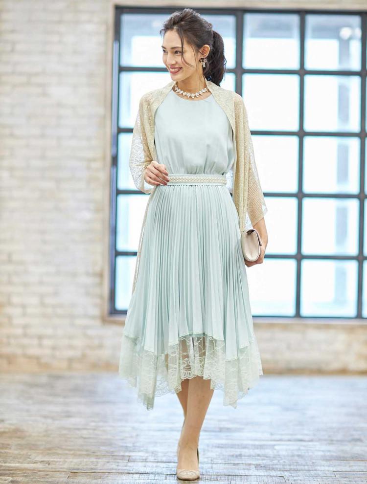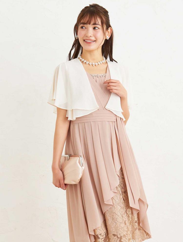 一番春らしい雰囲気を視覚的に感じるのがカラー。中でもお花をイメージさせる「ピンク」や、木々の新芽をイメージさせる「グリーン」が人気。また、優しい印象の「ベージュ」も春におすすめです。春のベージュドレスのコーディネートは、定番ブラックではなくゴールドやピンクなど明るい色合いがおすすめです。また、季節問わず着られるネイビーやブルーのドレスも春に着ても大丈夫。透け感のある素材などで軽やかに着こなすのがポイントです。