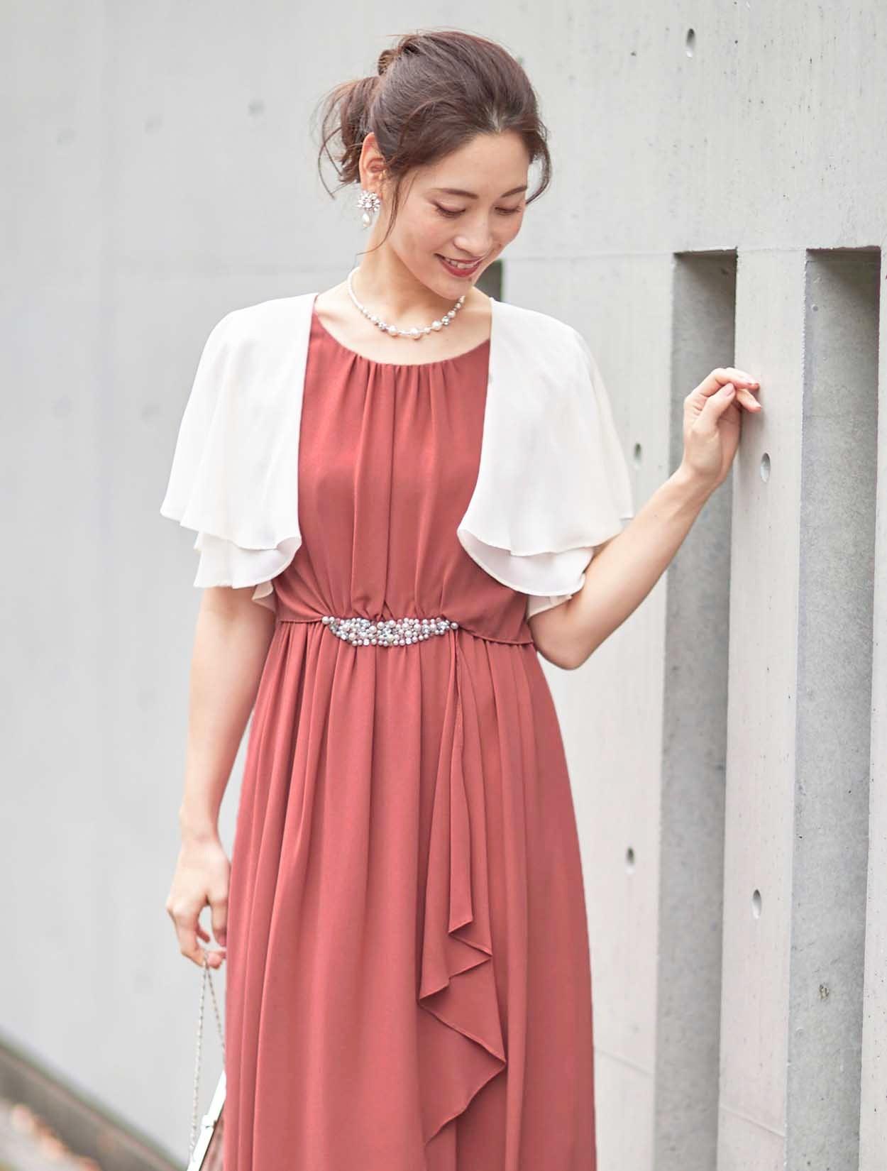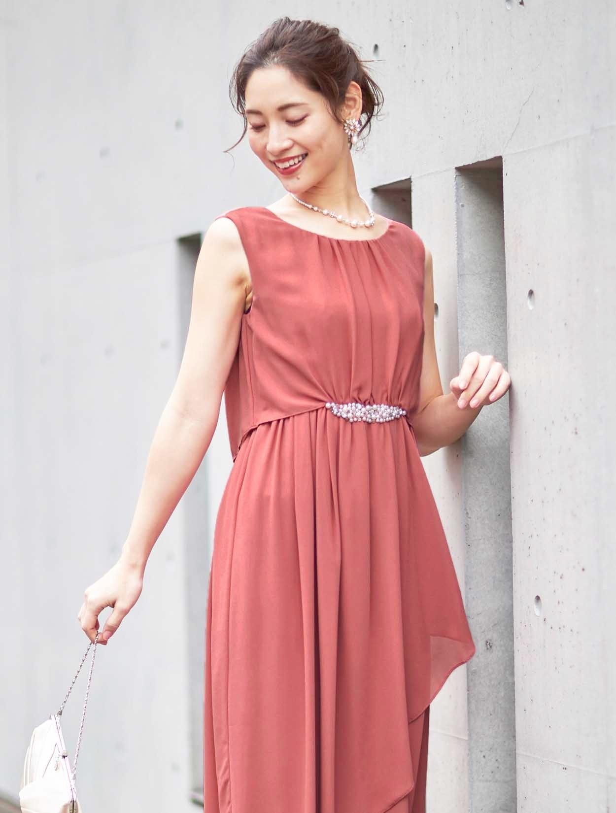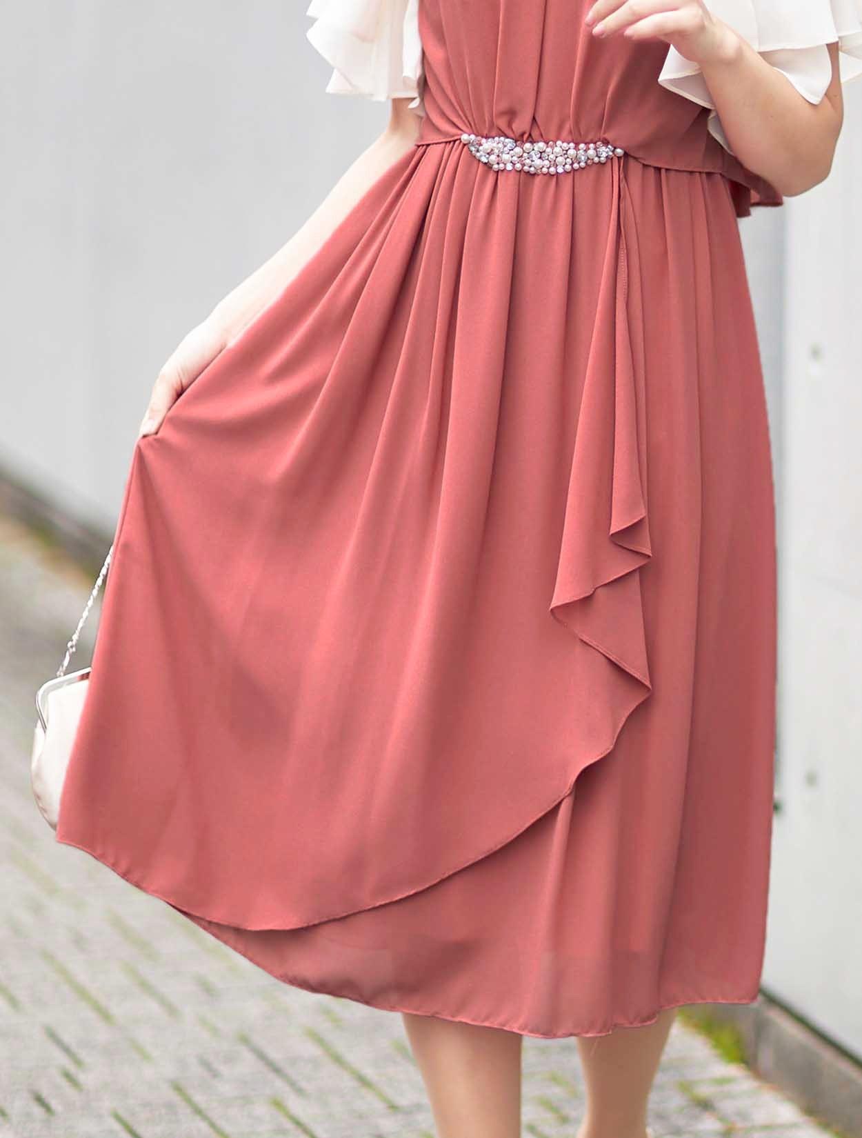■ウエストにビジューがついた上品な丈長めのシフォンドレス。