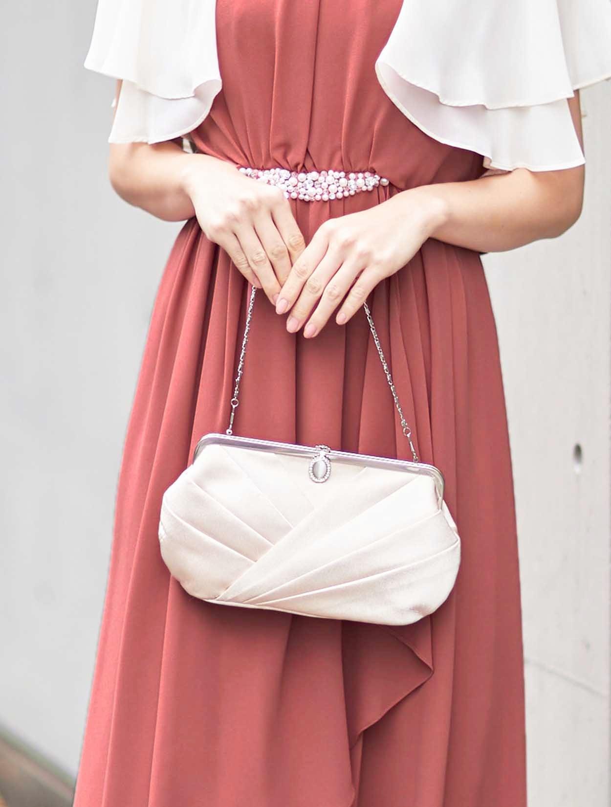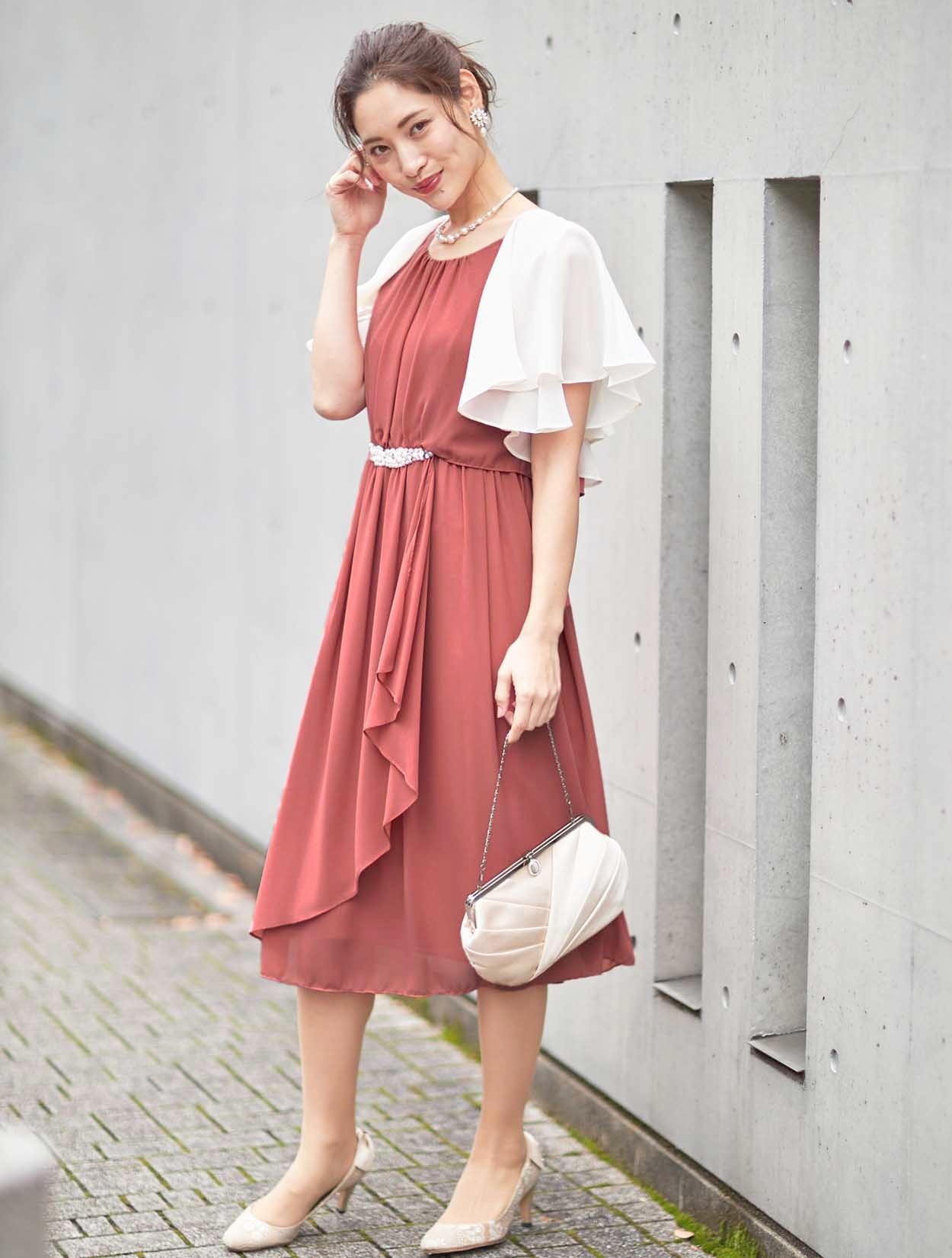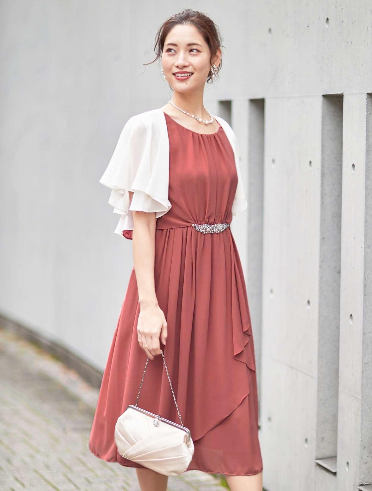 ■ウエストにビジューがついた上品な丈長めのシフォンドレス。