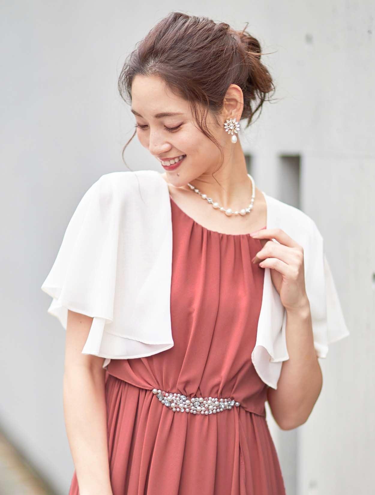 ■明るいベージュのボレロがピンクのドレスによく合うかわいいコーディネートです。