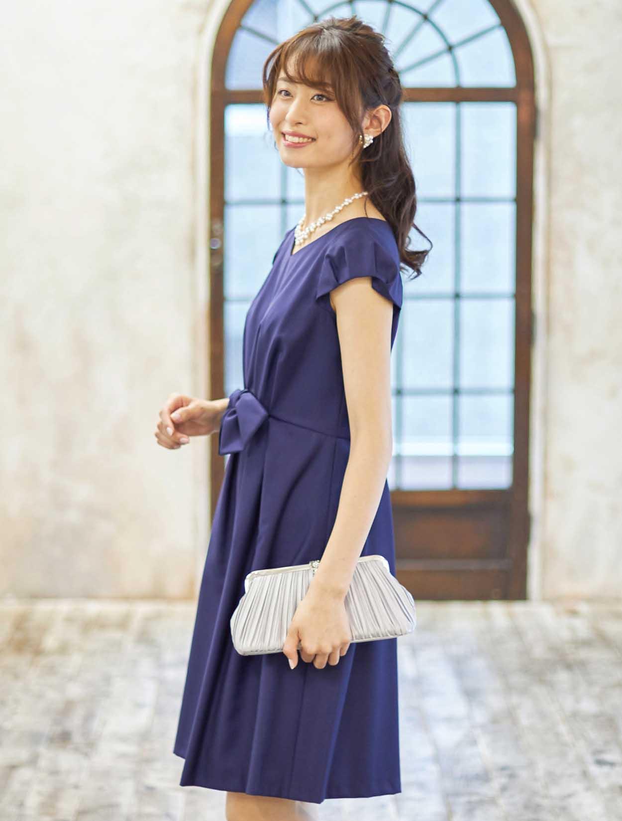 ■青に近いネイビーカラーで、写真映えする上品なドレスです。シンプルデザインながらも袖のパフスリーブがかわいらしくアクセントに。