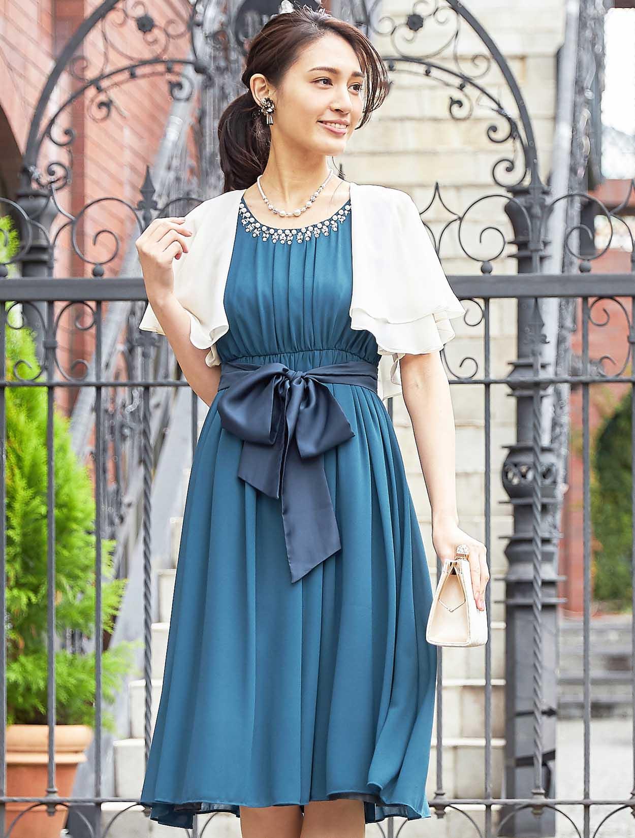 ■少しグリーン寄りの落ち着いたブルーカラーのドレスです。