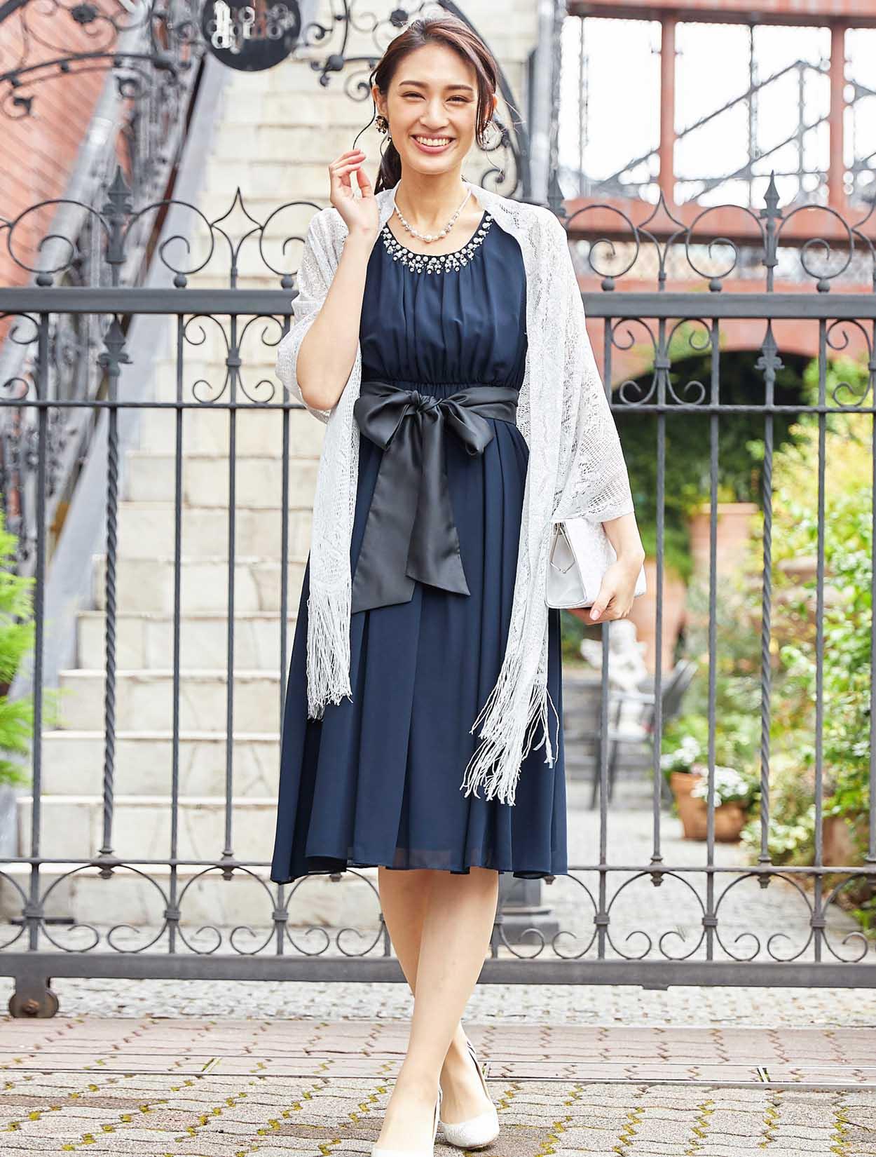 ■落ち着いたネイビーのドレスは、全身を引き締めて見せてくれるのでスタイル効果アップも抜群です。