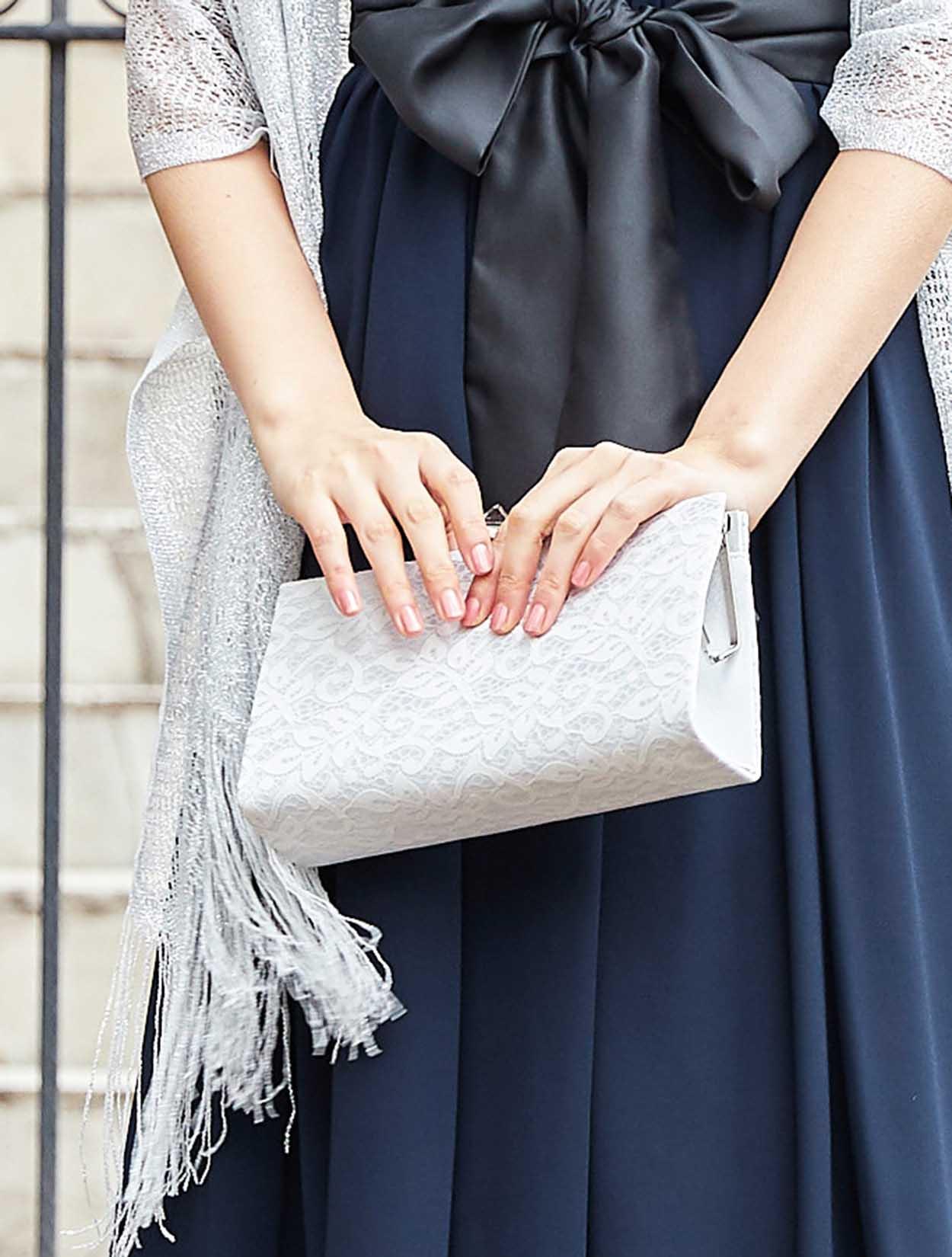 ■丈長めのドレスにシルバーのショールを合わせた大人っぽく上品なコーディネートです。