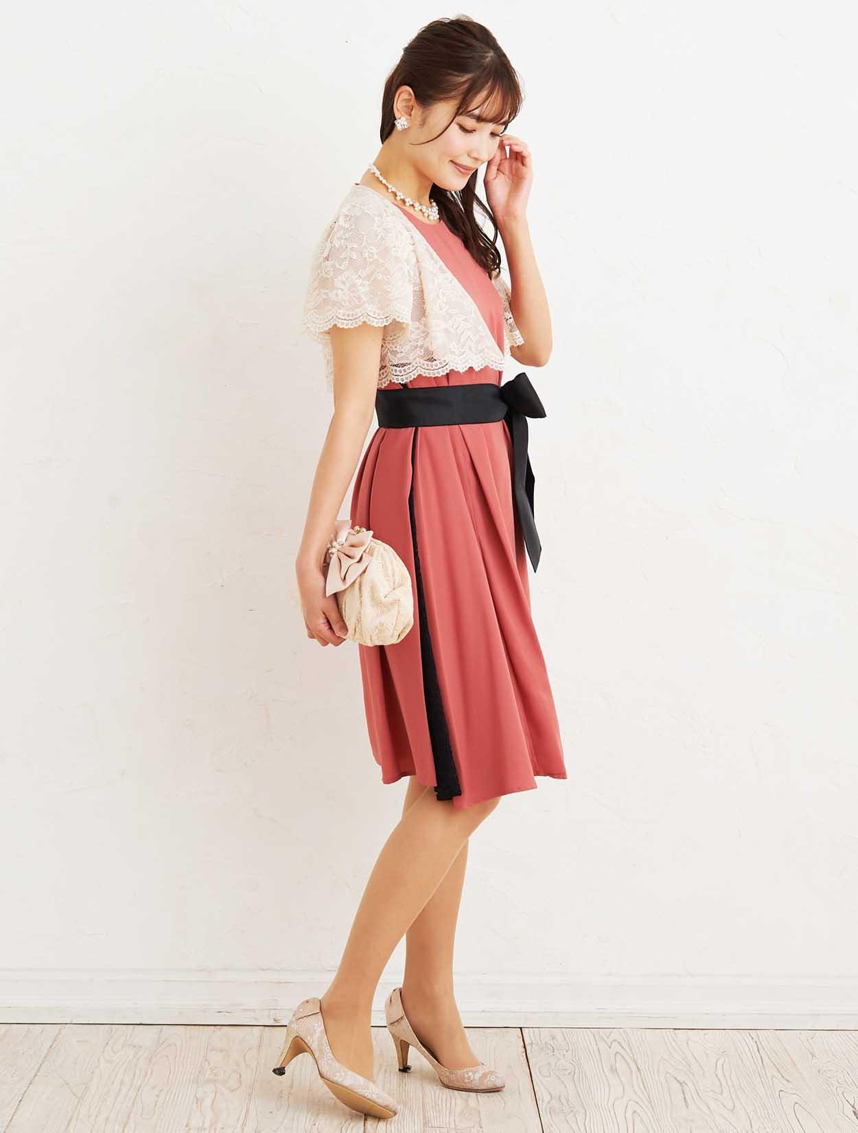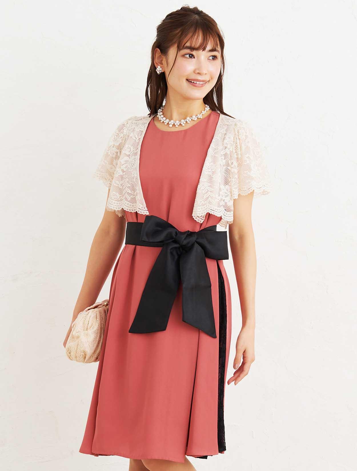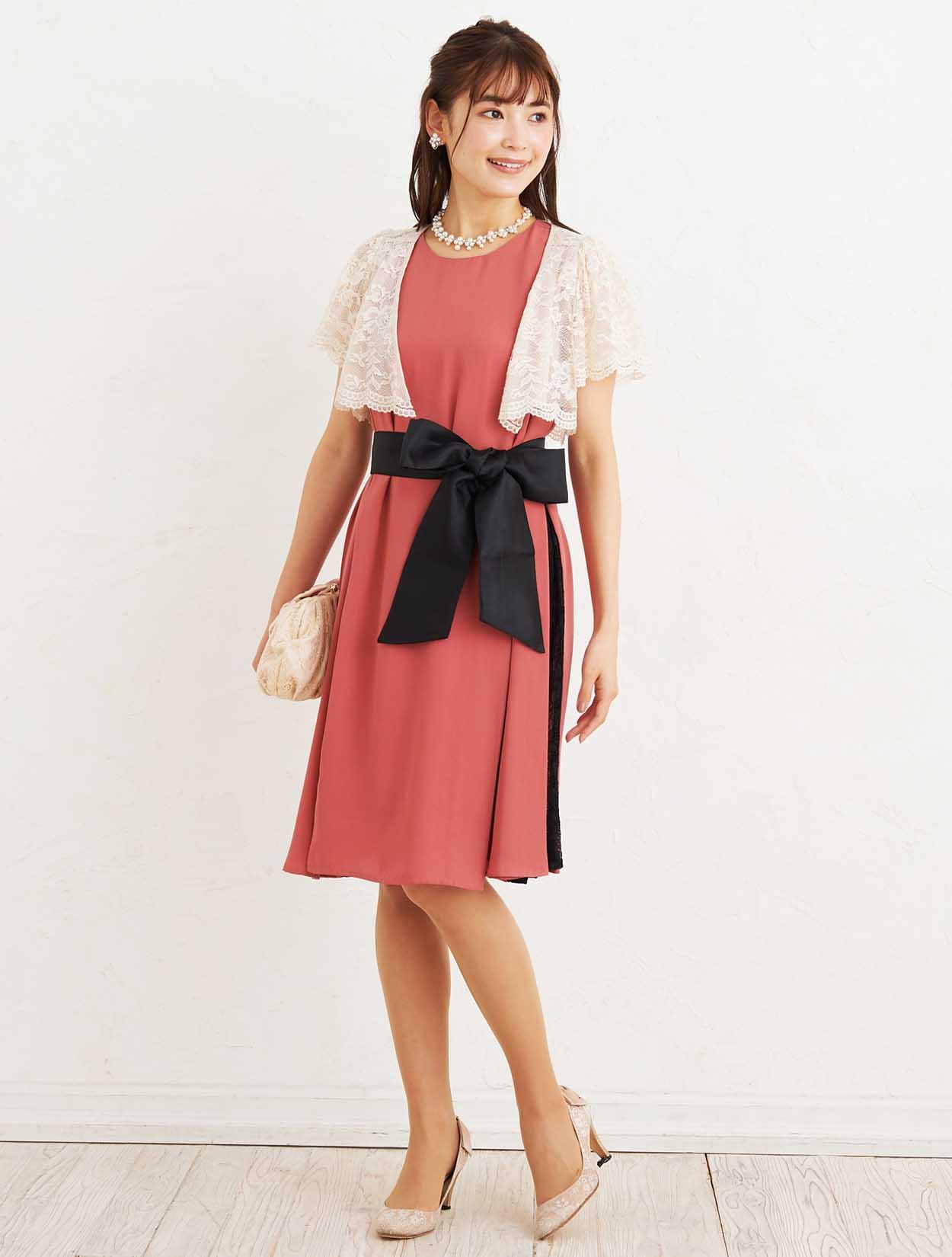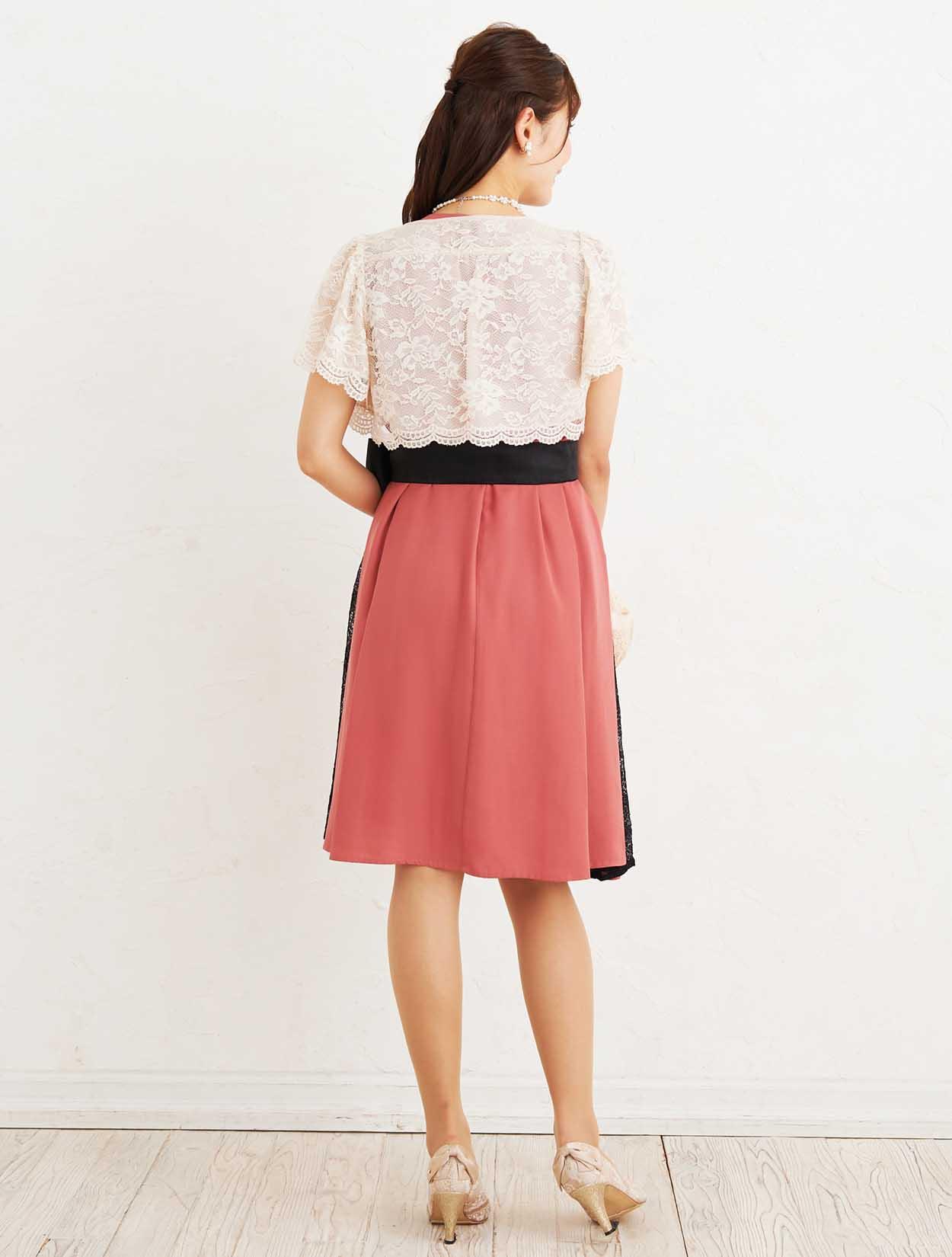■明るいサーモンピンクのマタニティドレスに、リバーシブルのボレロを合わせたフェミニンなコーディネートです。