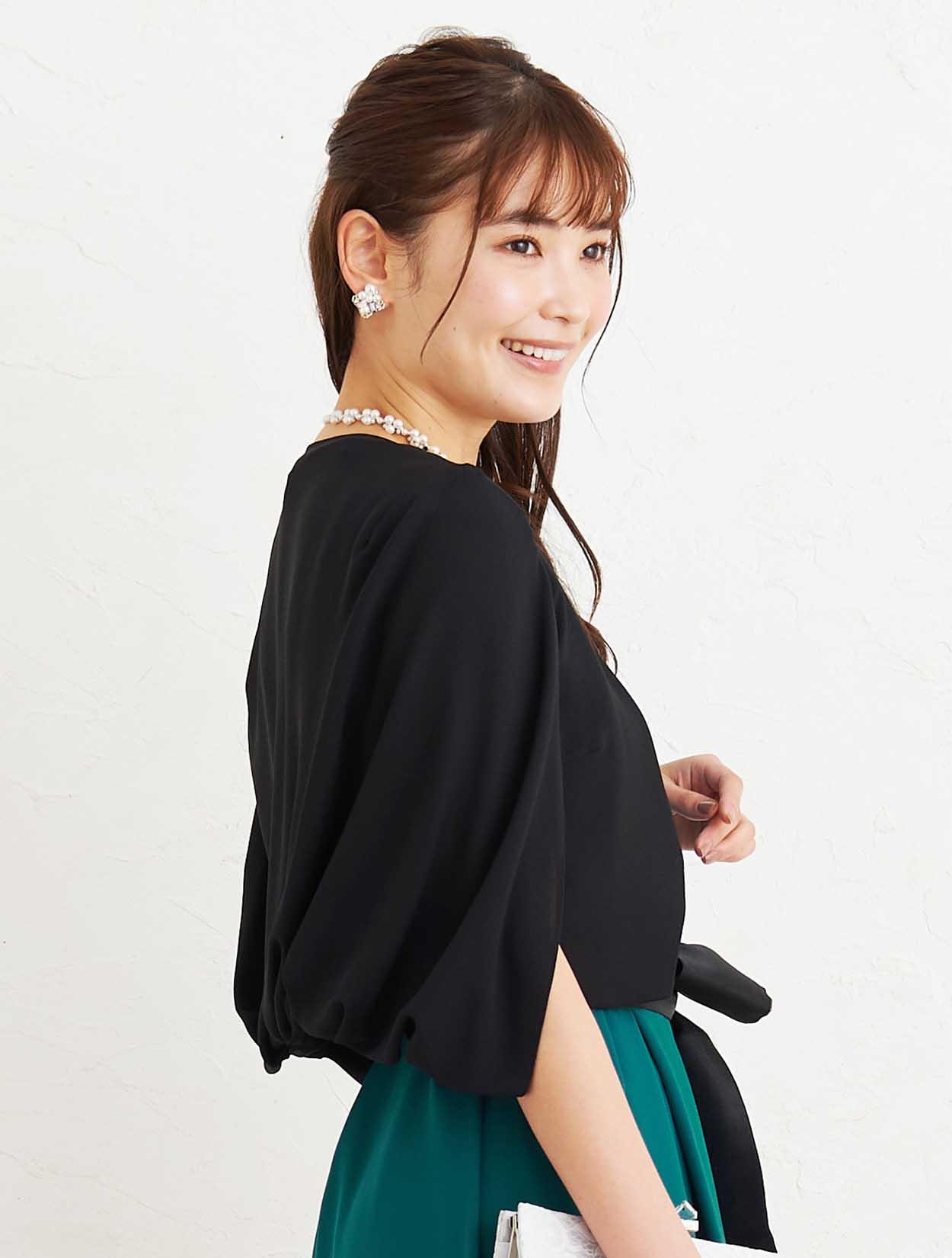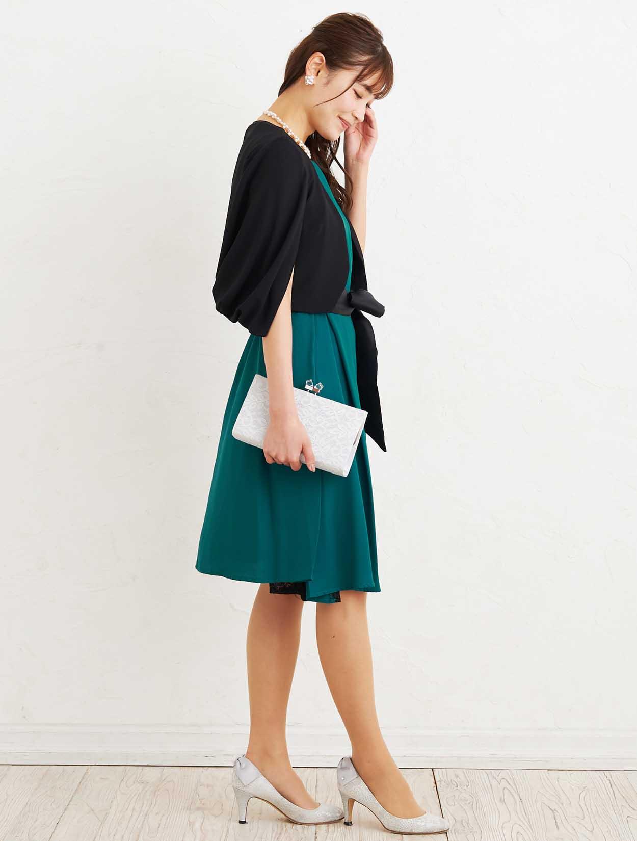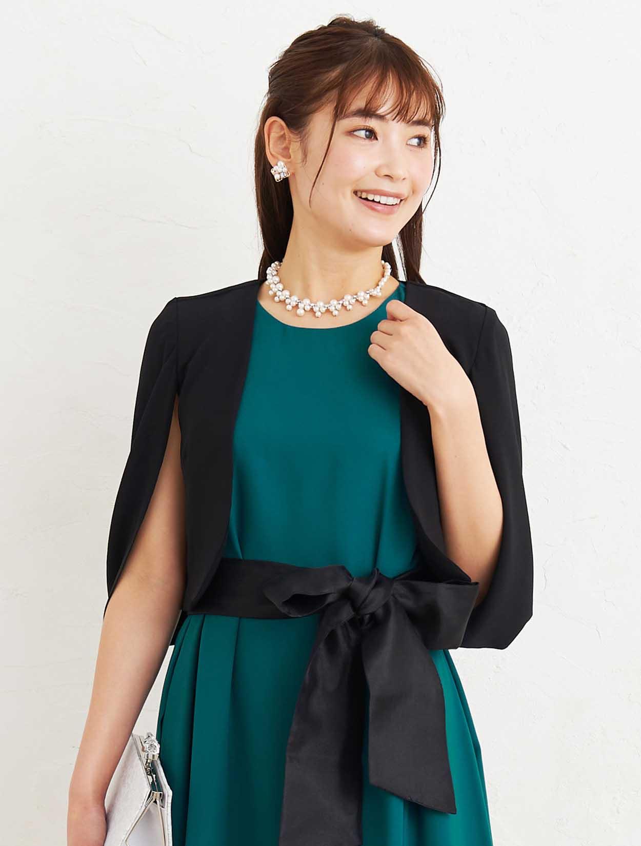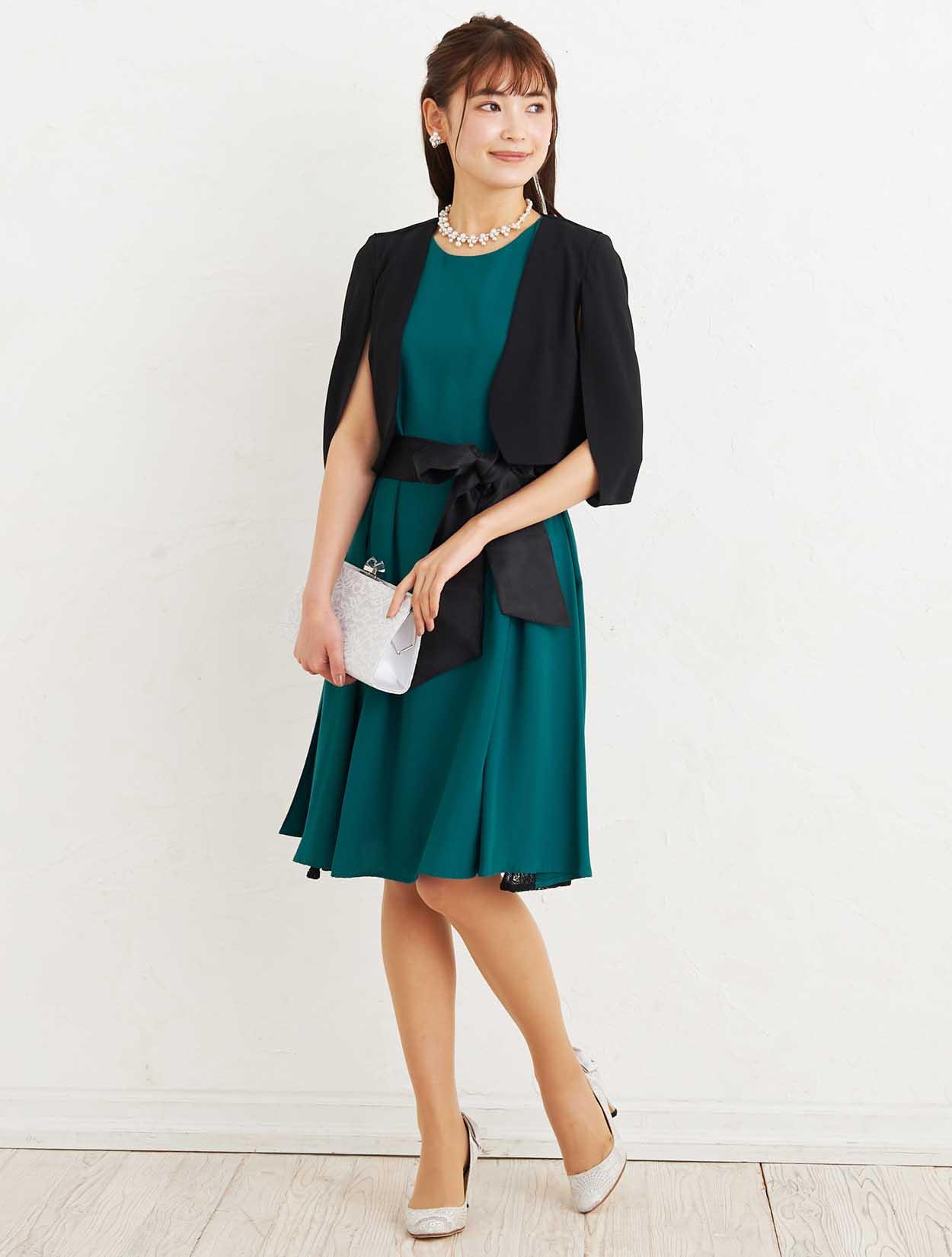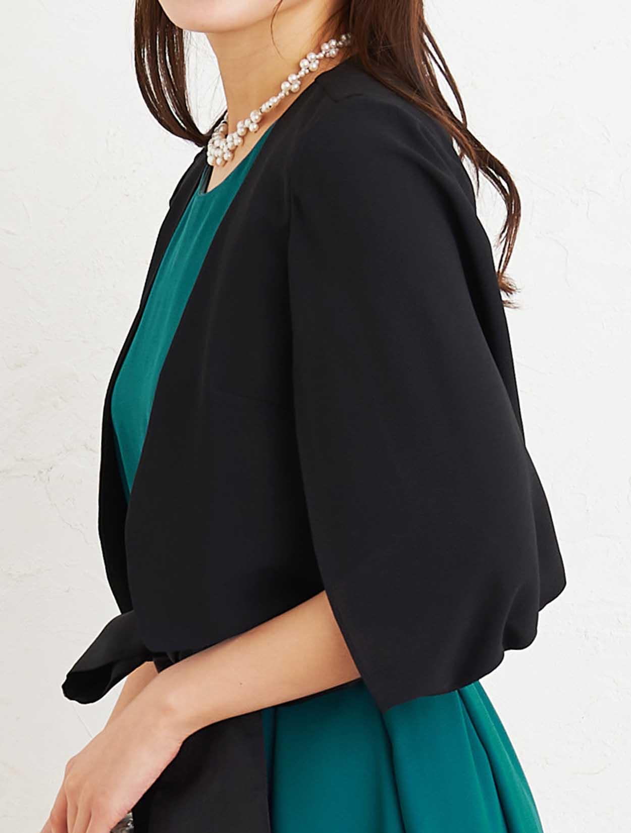 ■深いグリーンのマタニティドレスにブラックのジャケットボレロでアクセントを付けた大人なコーディネートです。