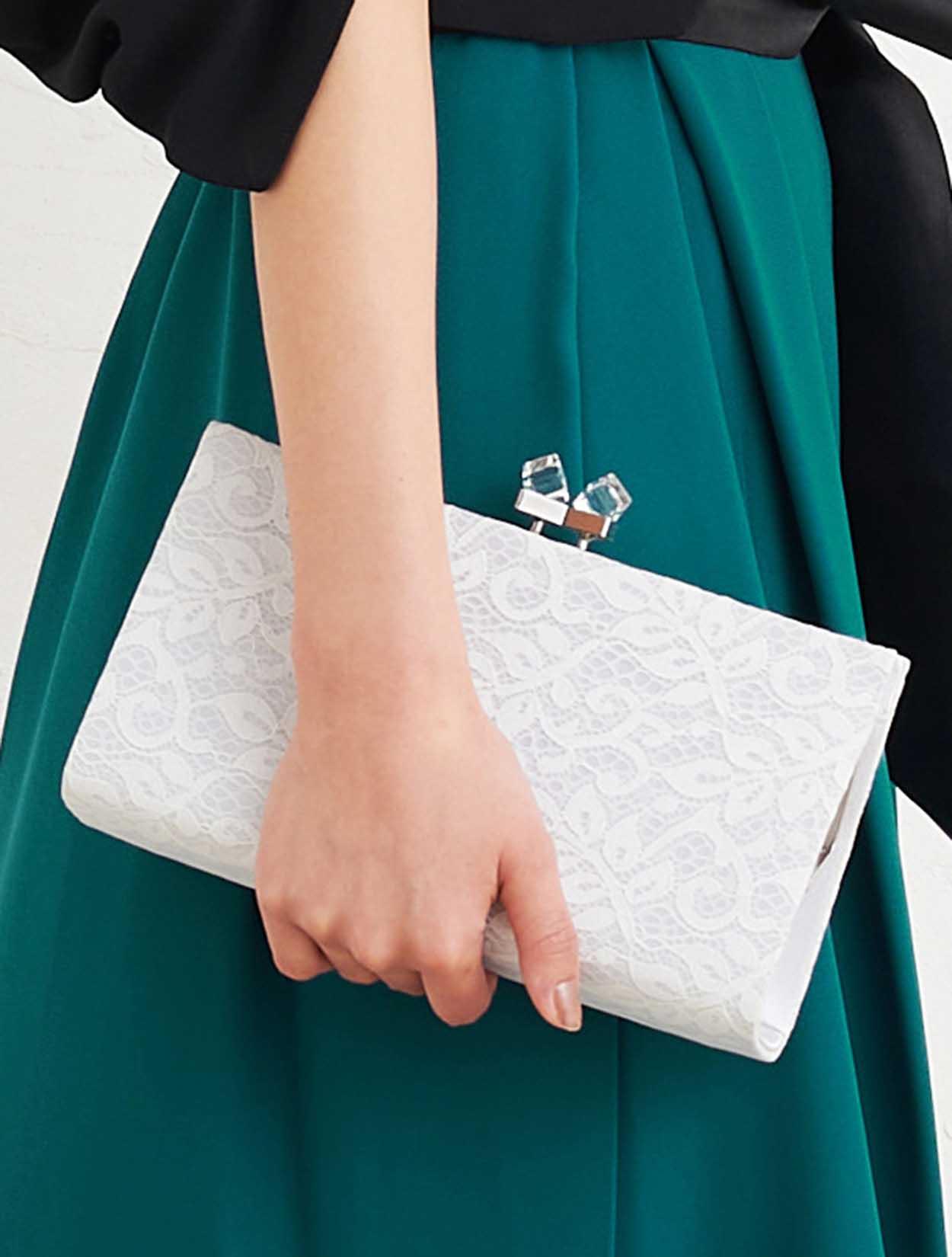 ■シルバーのレースバッグと、存在感のあるパールのネックレスで華やかな印象に。