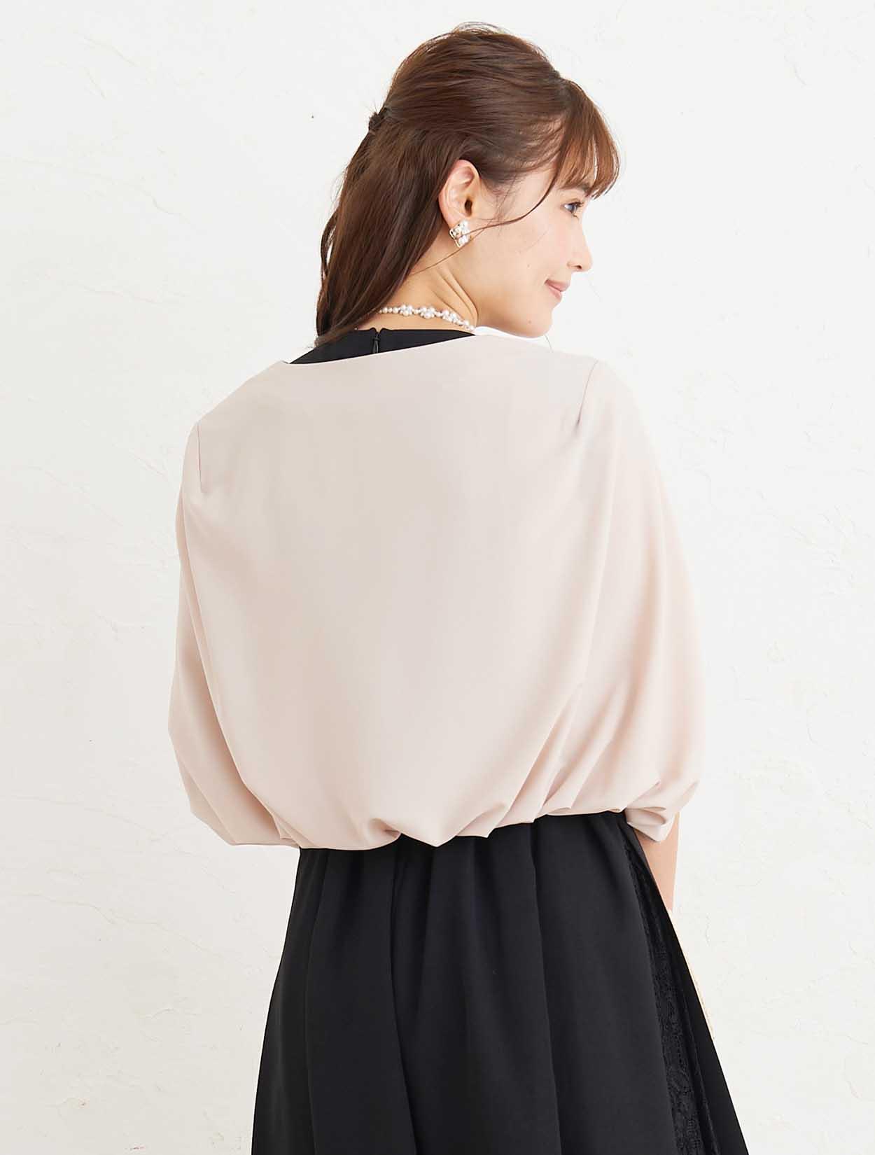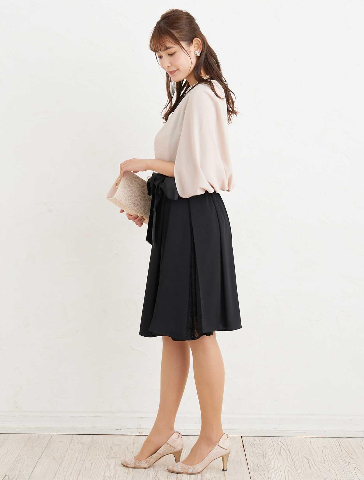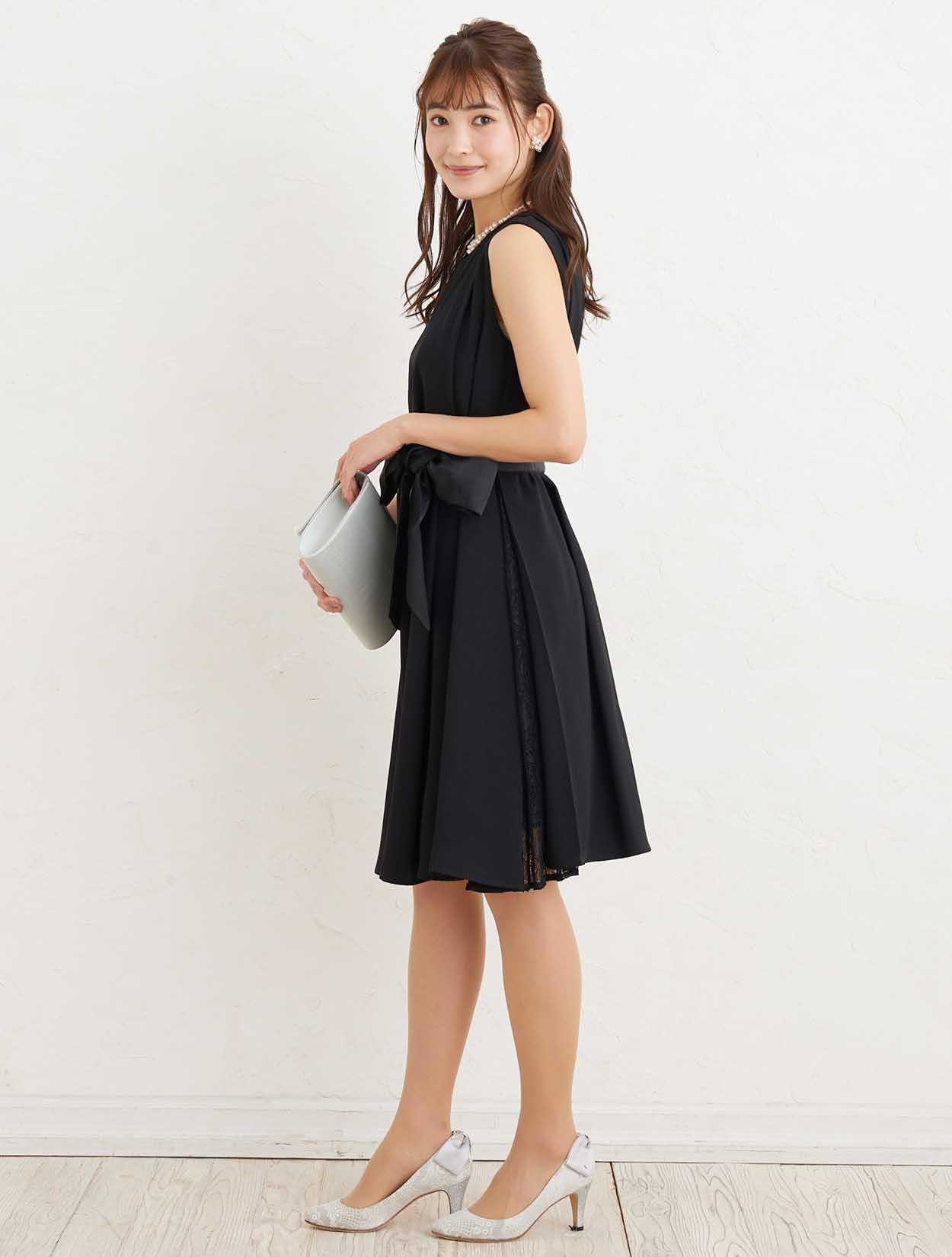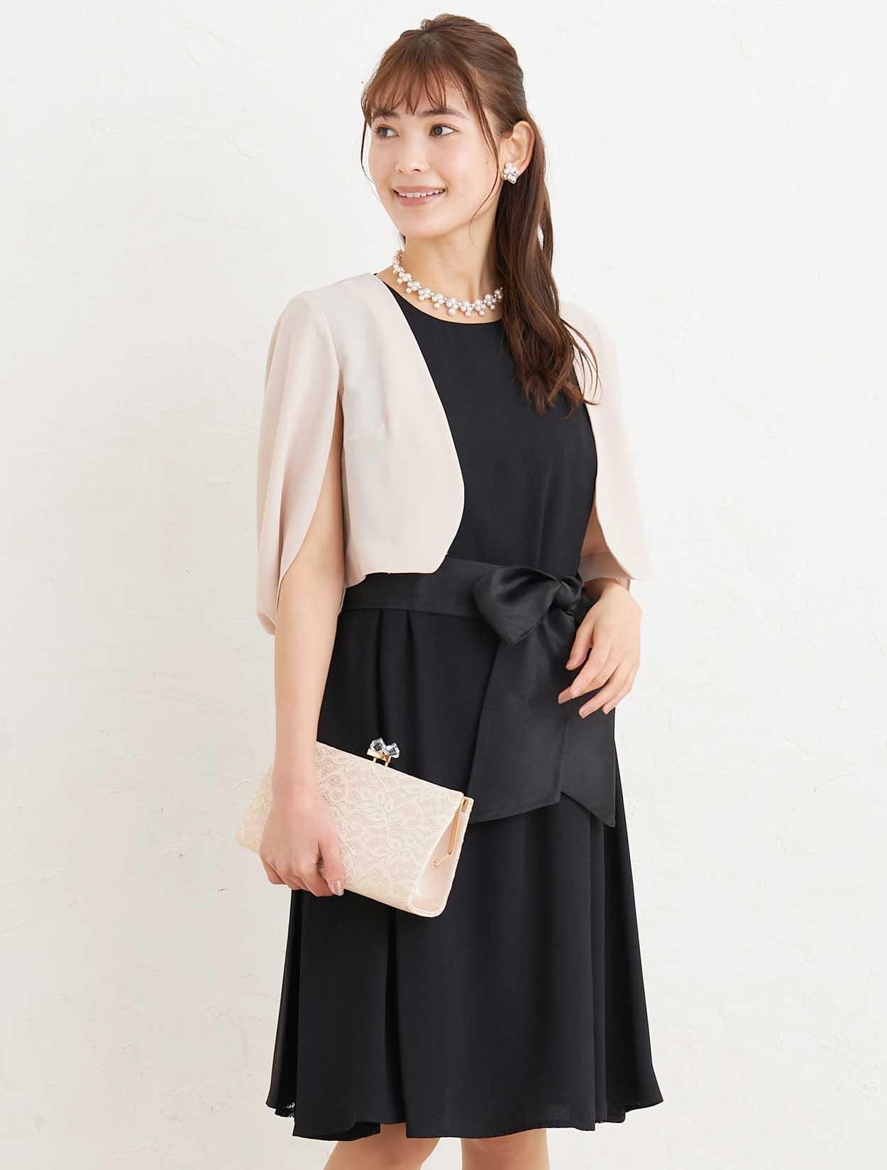 ■小物はベージュで合わせると、ブラックのドレスも優し気な印象で着て頂けます。首元はスカラップ調に編み込んたパールのネックレスで華やかに。