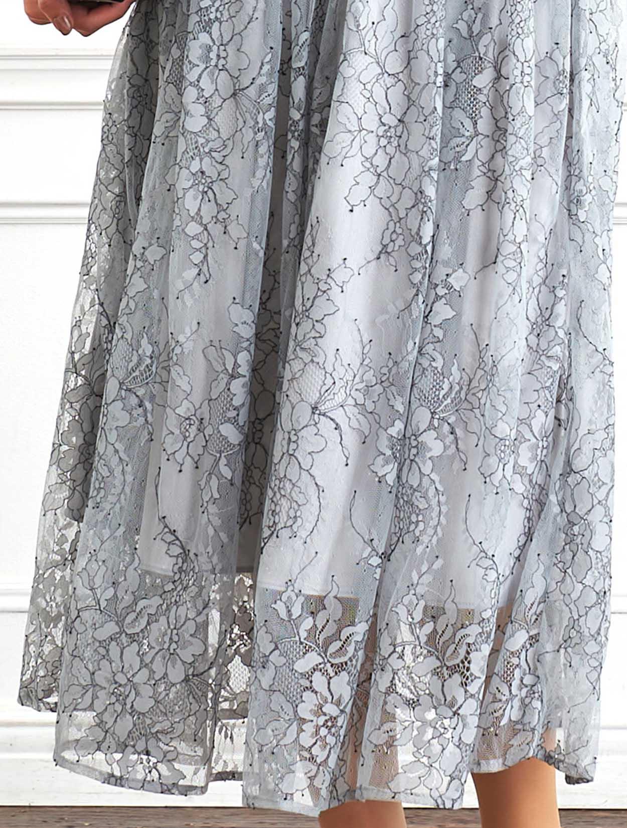 ■少し明るめのネイビーの総レースドレスに、シルバーのバッグを合わせた上品なコーディネートです。