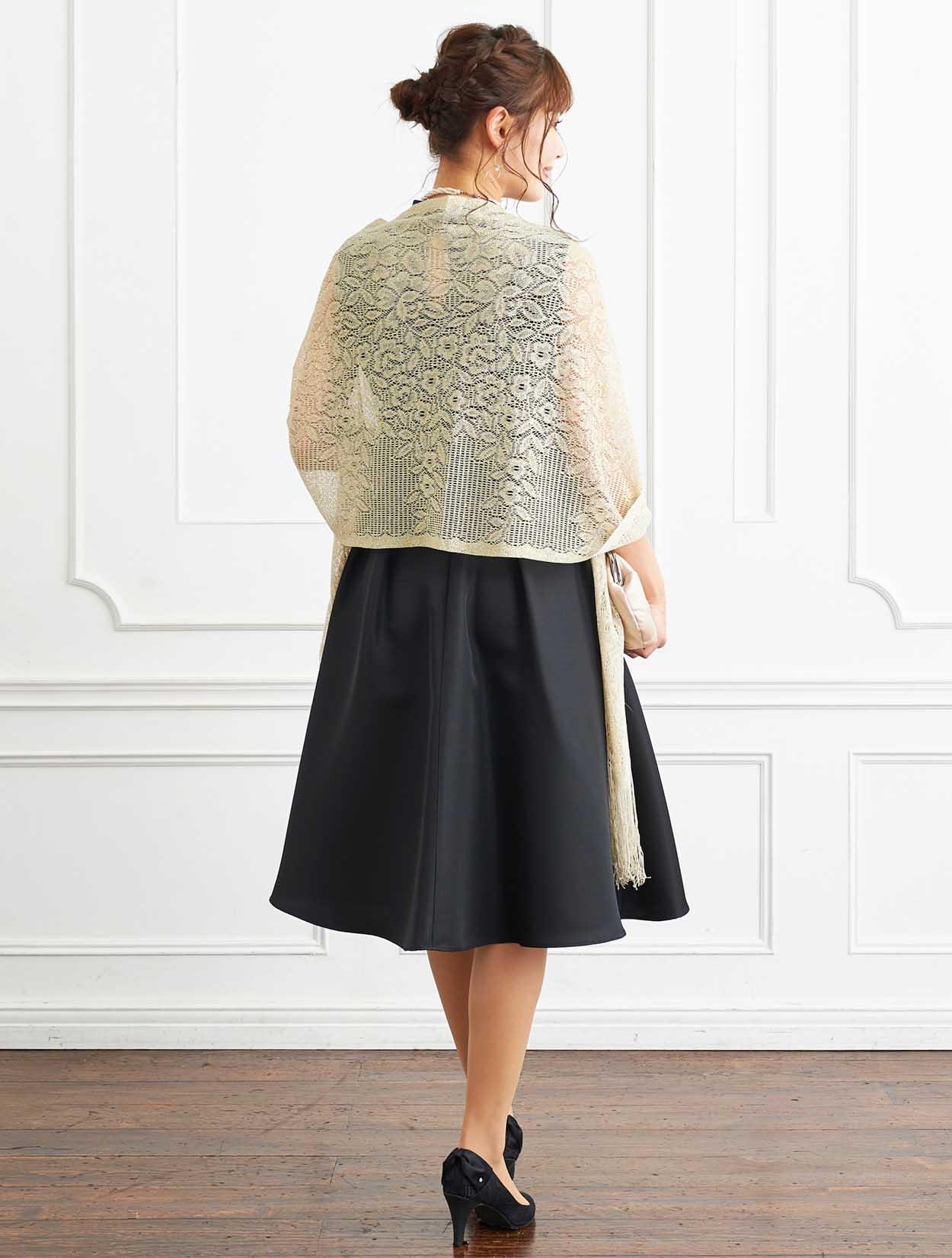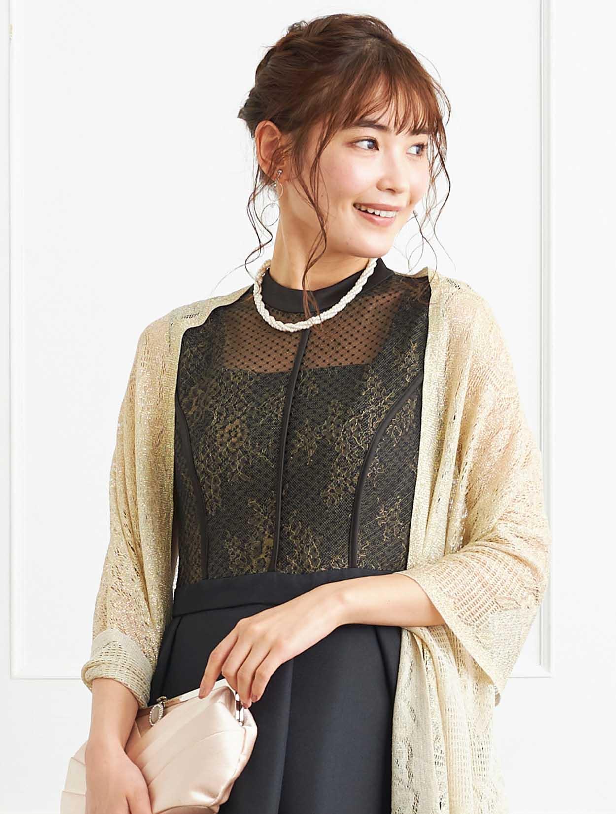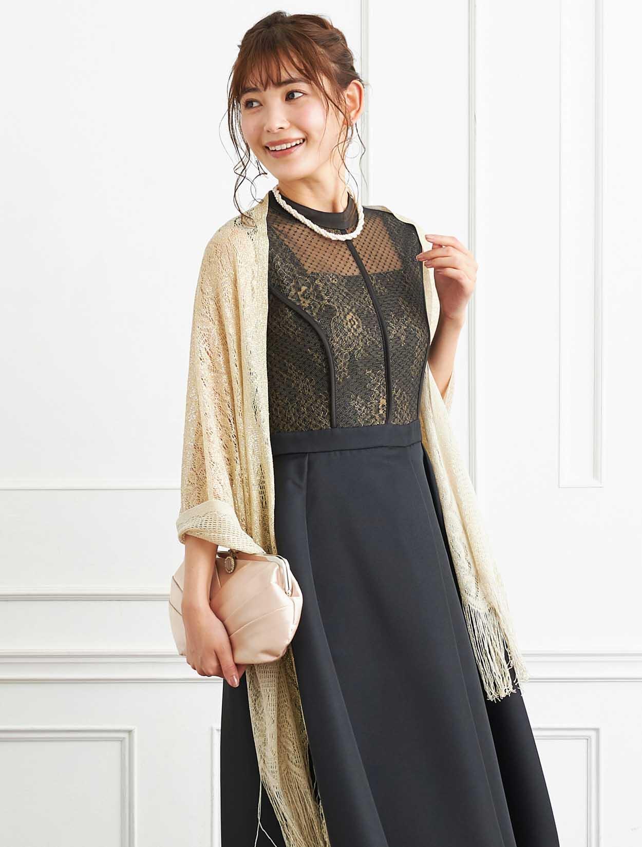 ■重厚感のあるブラックのドレスとゴールドのラメストールで高級感のあるコーディネートです。