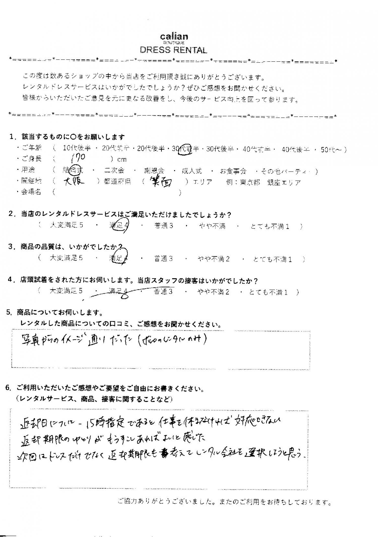 返却日について、15時指定であると仕事を休まないと対応できない。返却期限のゆとりがもう少しあればよいと感じた。次回はドレスだけでなく返却期限も考えてレンタル会社を選択しようと思う。