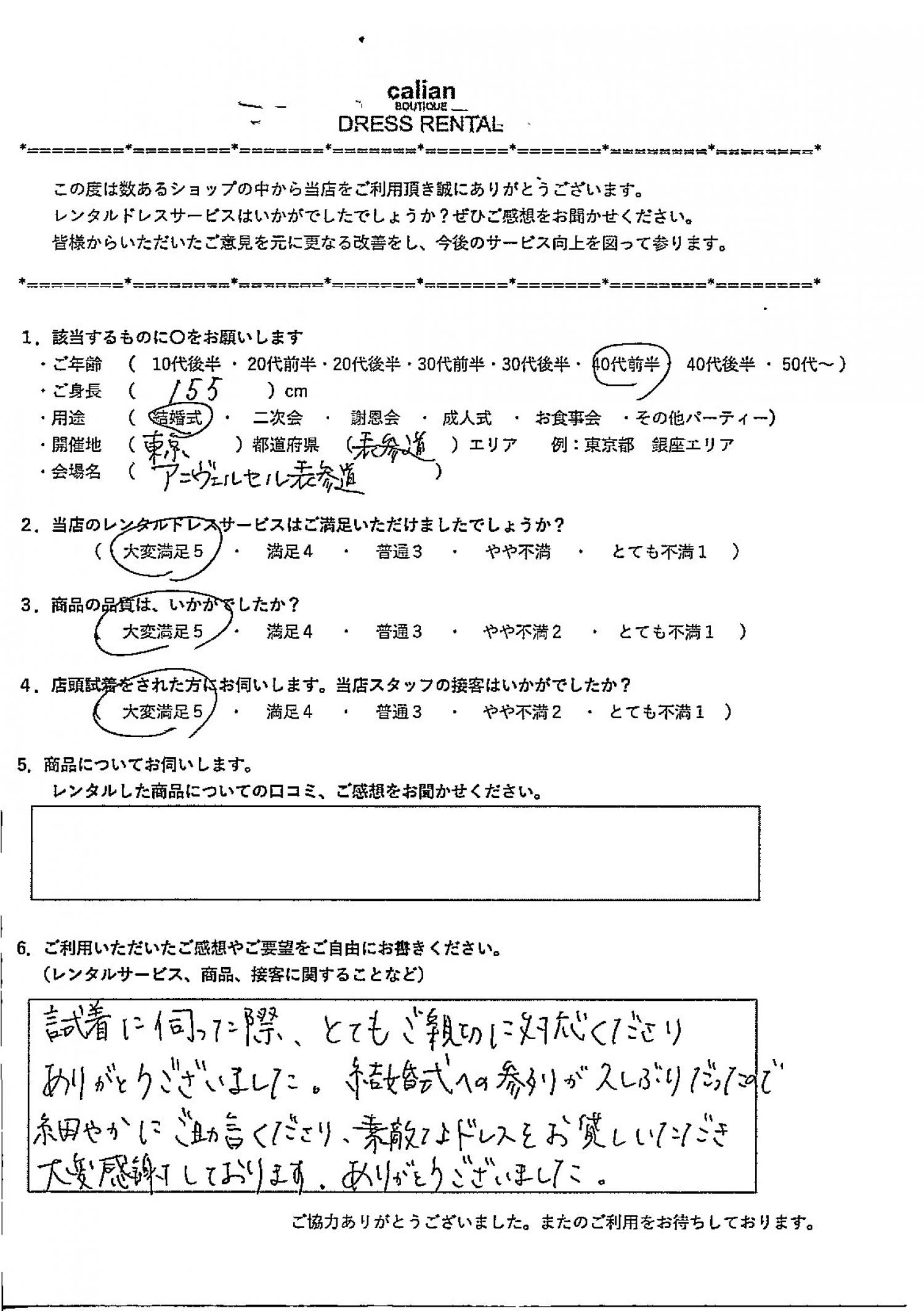 結婚式への参列が久しぶりだったので細やかにご助言くださり、素敵なドレスをお貸しいただき大変感謝しております。