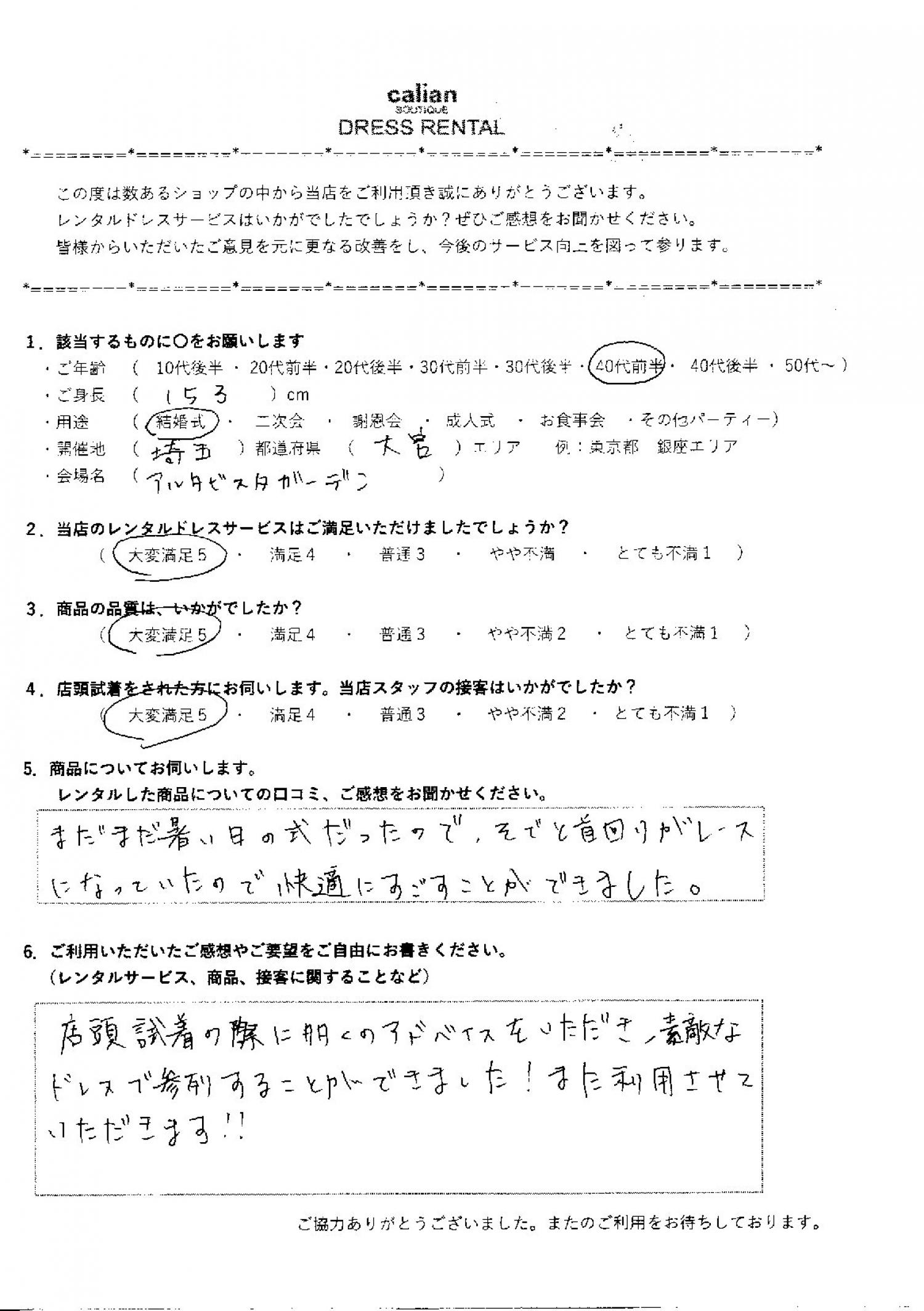 店頭試着の際に多くのアドバイスをいただき、素敵なドレスで参列することができました!また利用させていただきます!!