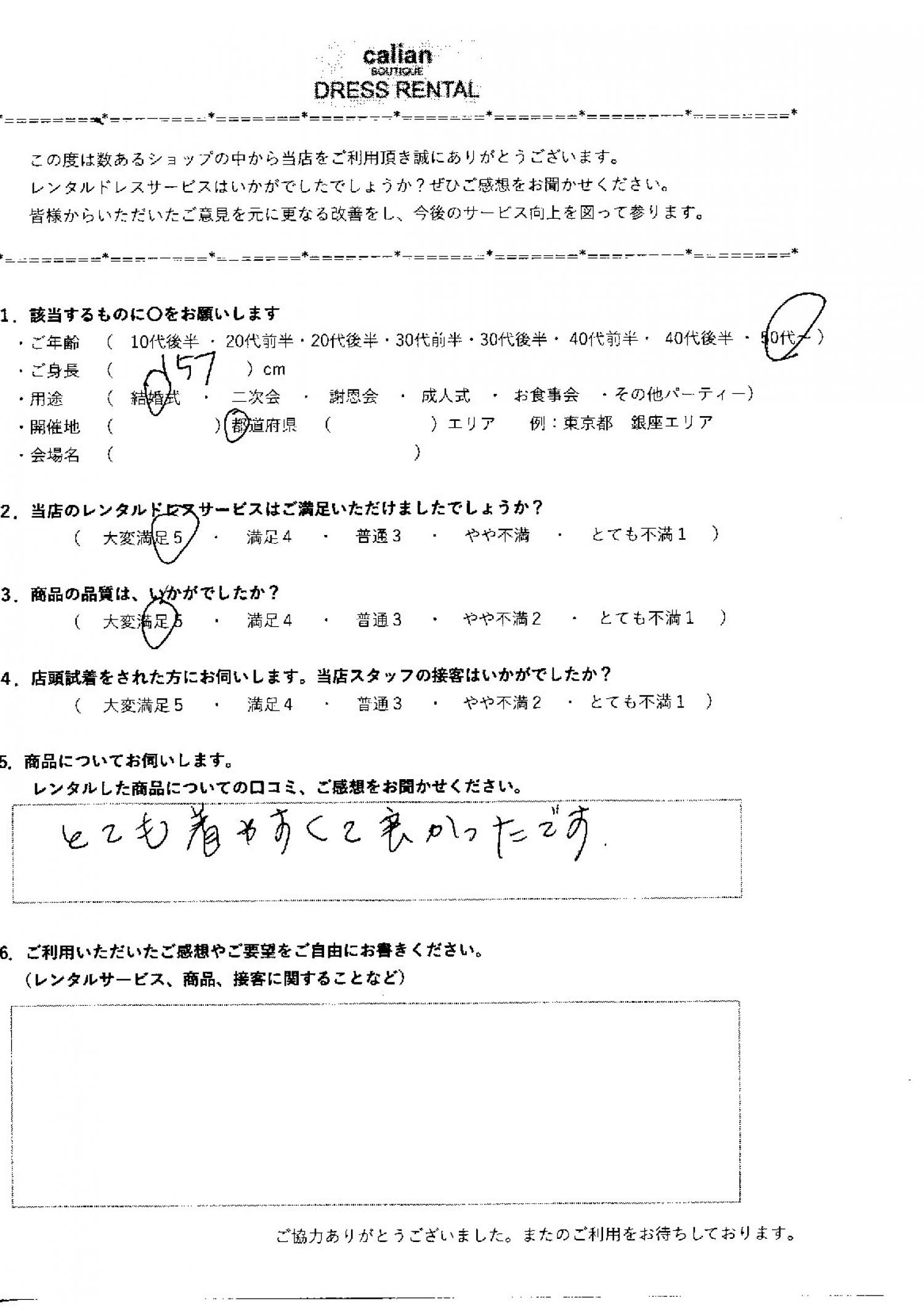 2025/11/08 結婚式利用 東京都 LLサイズ (5点) 利用シーン 結婚式 都道府県 東京都 年代 50代~ お客様からの声 今回ご利用の商品 ドレス FT242D3043-15-L 1.該当するものを選択してください ・ご年齢 50代~・ご身長 157cm・用途 結婚式・開催地 東京都 2.当店のレンタルドレスサービスはご満足いただけましたでしょうか? (5点) 3.商品の品質は、いかがでしたか? (5点) 4.商品についてお伺いします。レンタルした商品についての口コミ、ご感想をお聞かせください。 とても着やすくて良かったです。