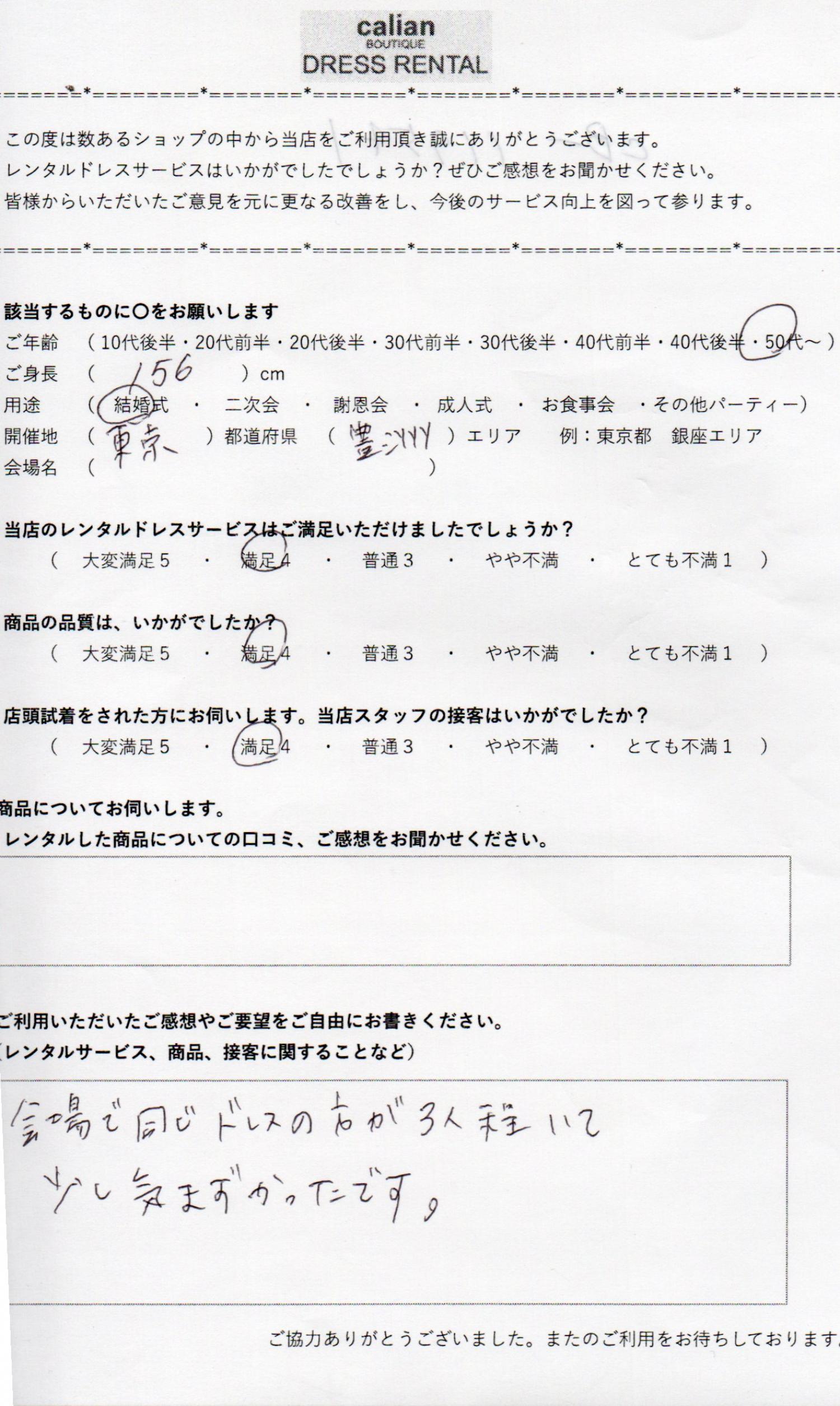 会場で同じドレスの方が3人ほどいて少し気まずかったです。