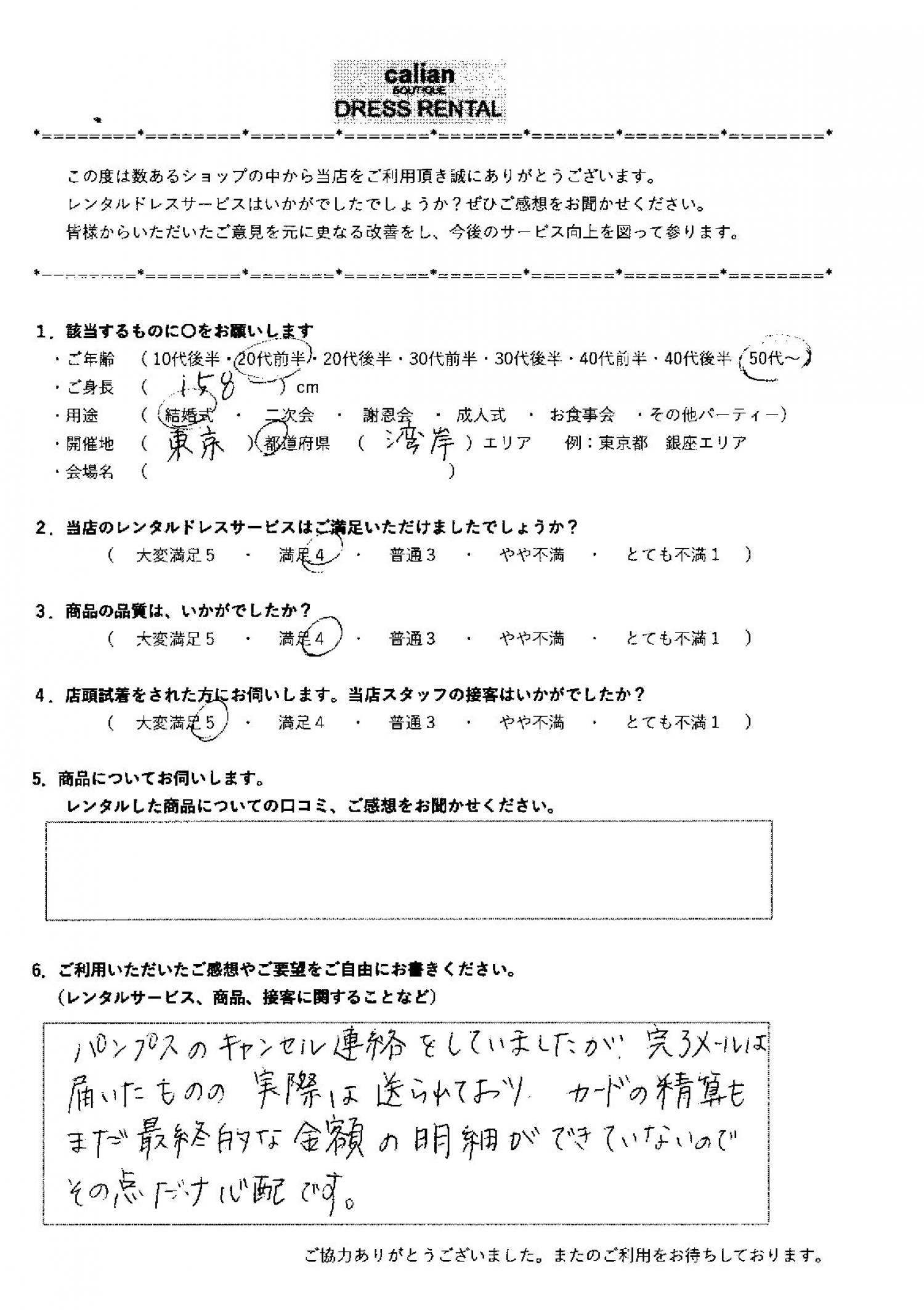 パンプスのキャンセル連絡をしていましたが、完了メールは届いたものの、実際は送られておりカードの精算もまだ最終的な金額の明細ができていないのでその点だけ心配です。
