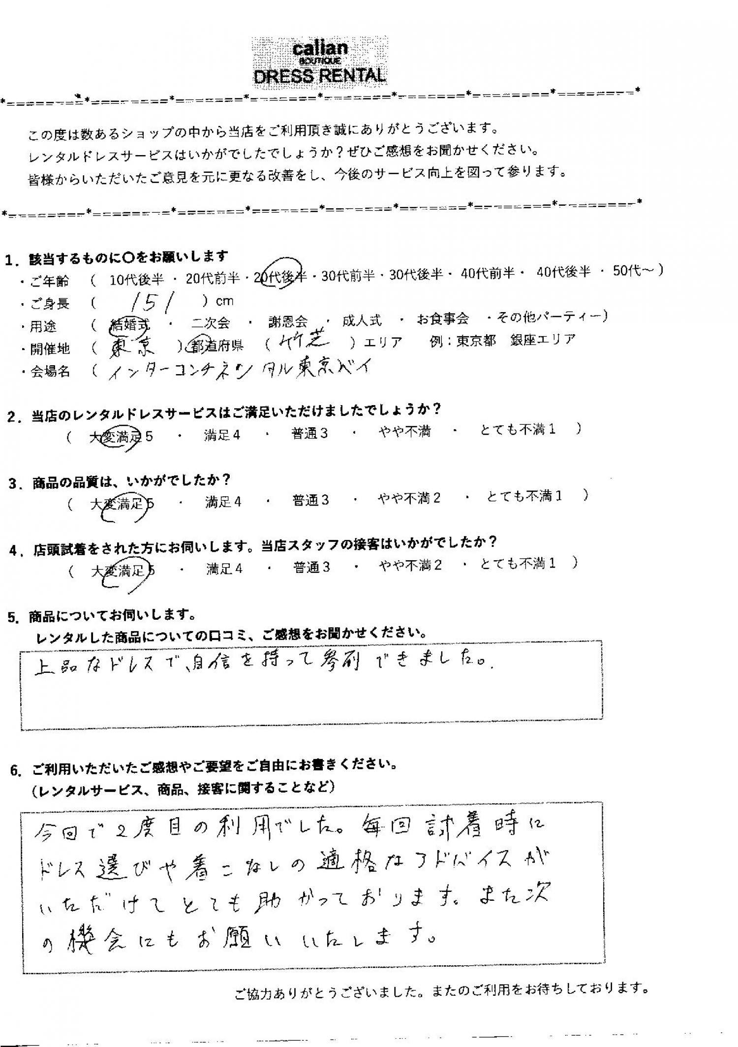 今回2度目の利用でした。毎回試着時にドレス選びや着こなしの適格なアドバイスがいただけてとても助かっております。また次の機会にもお願いいたします。