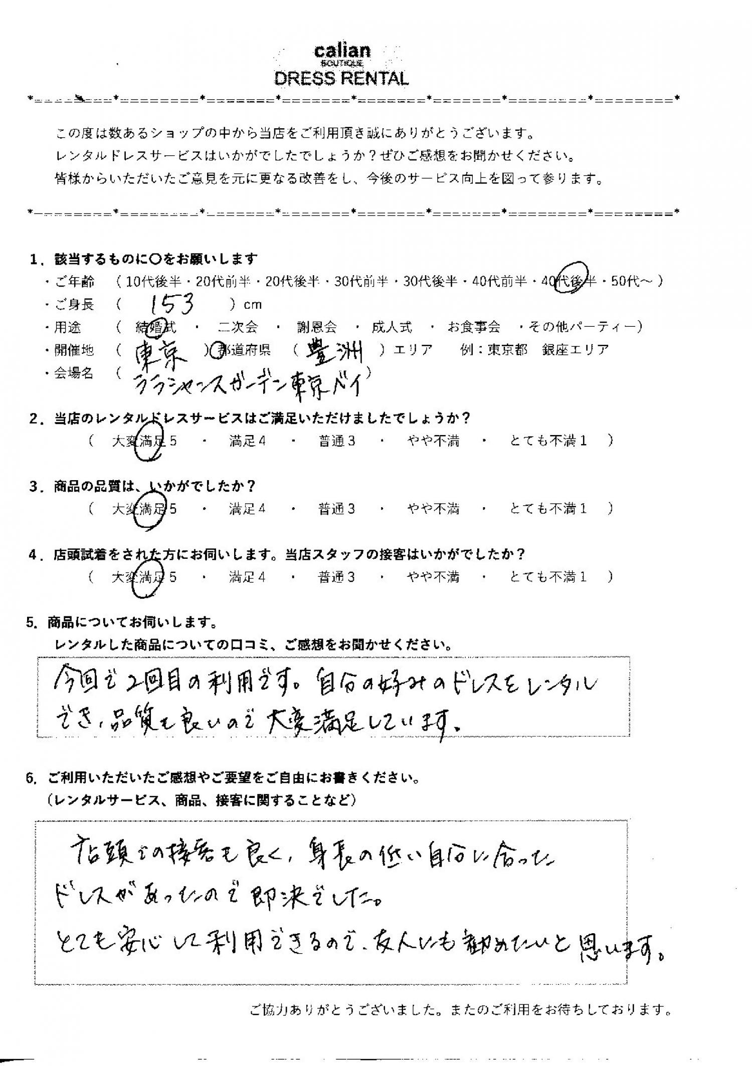今回で2回目の利用です。自分の好みのドレスをレンタルでき、品質も良いので大変満足しています。