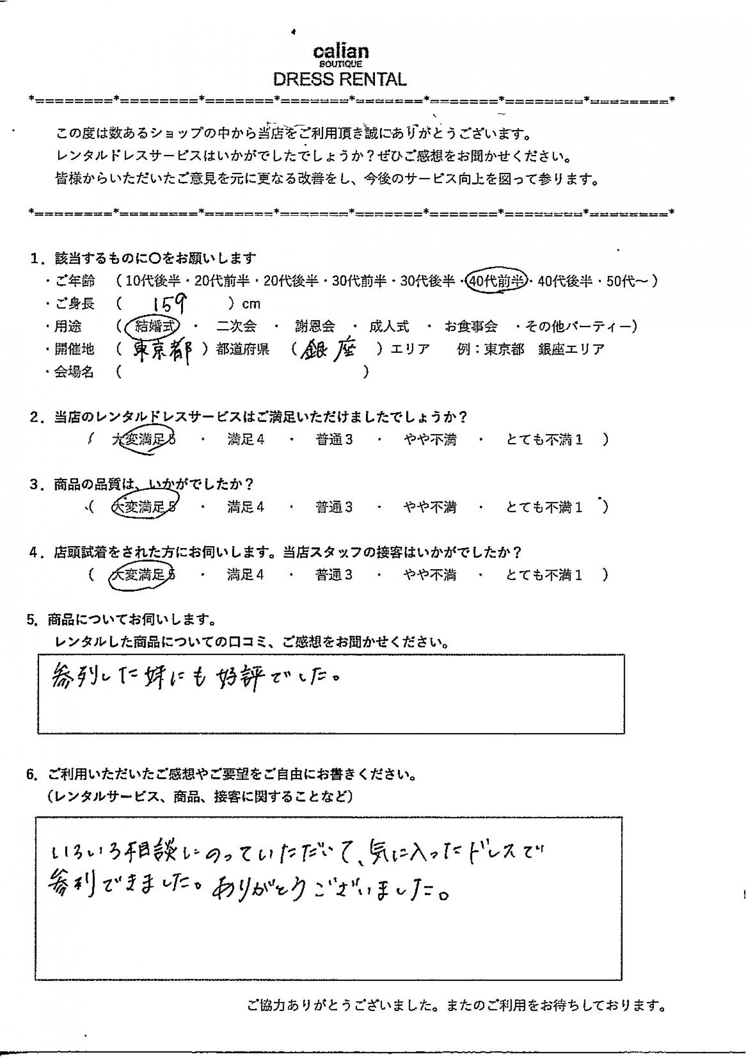 いろいろ相談にのっていただいて、気に入ったドレスで参列できました。ありがとうございました。
