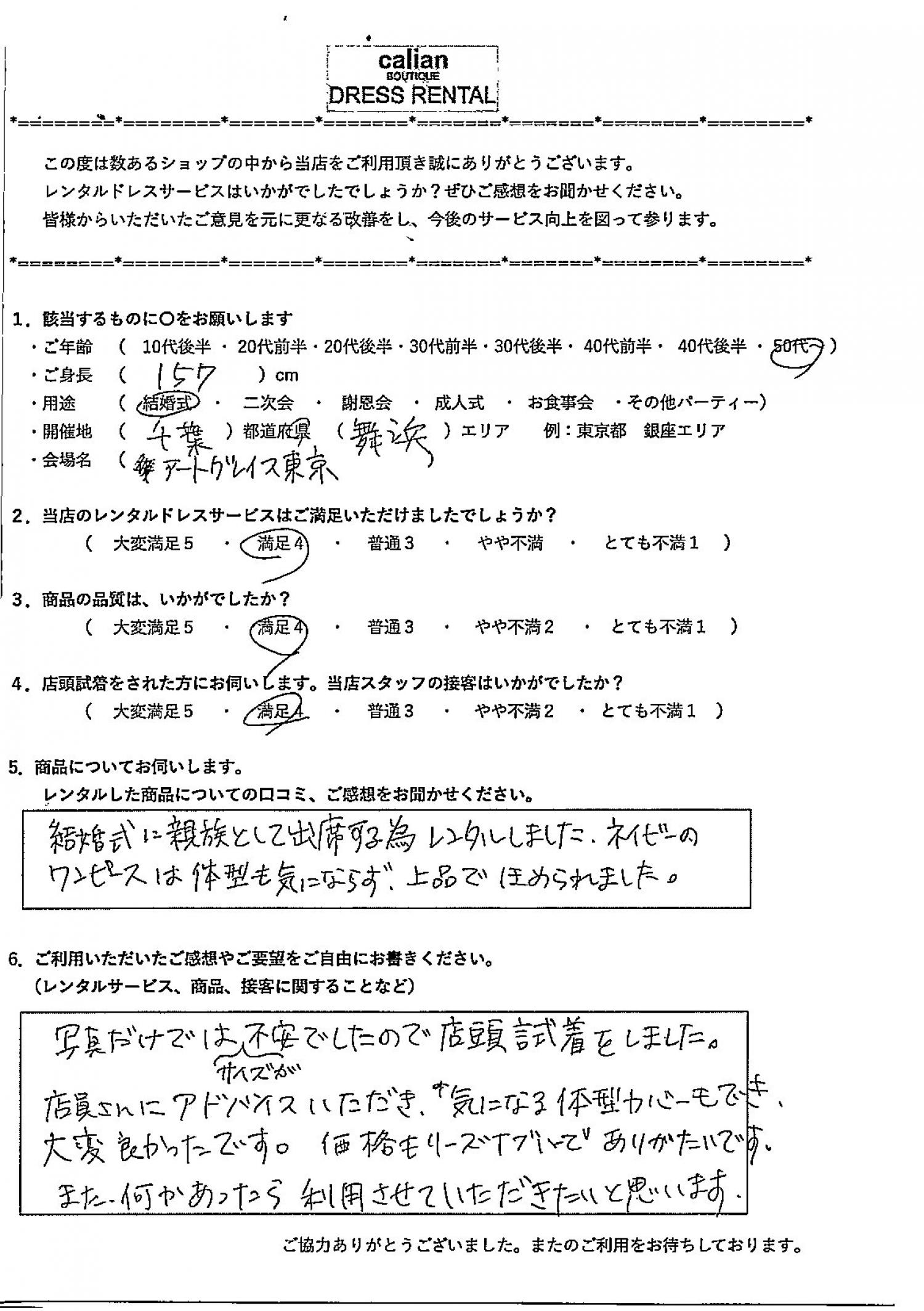 結婚式に親族として出席する為レンタルしました。ネイビーのワンピースは、体型も気にならず、上品でほめられました。