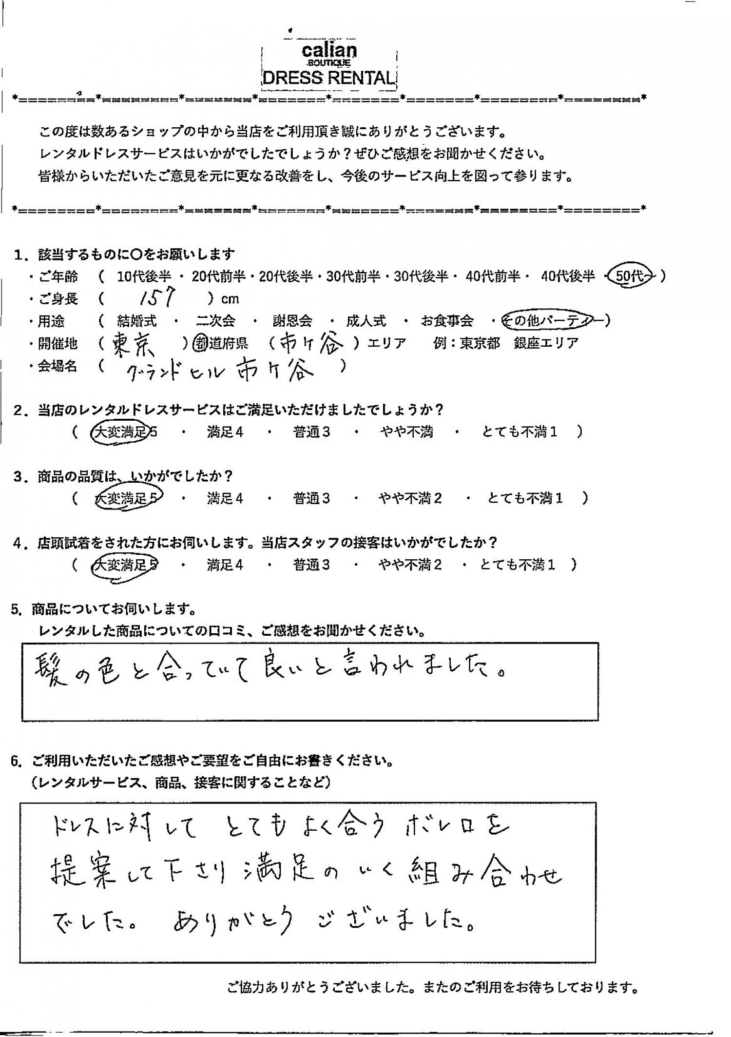 ドレスに対してとてもよく似合うボレロを提案して下さり満足のいく組み合わせでした。ありがとうございました。