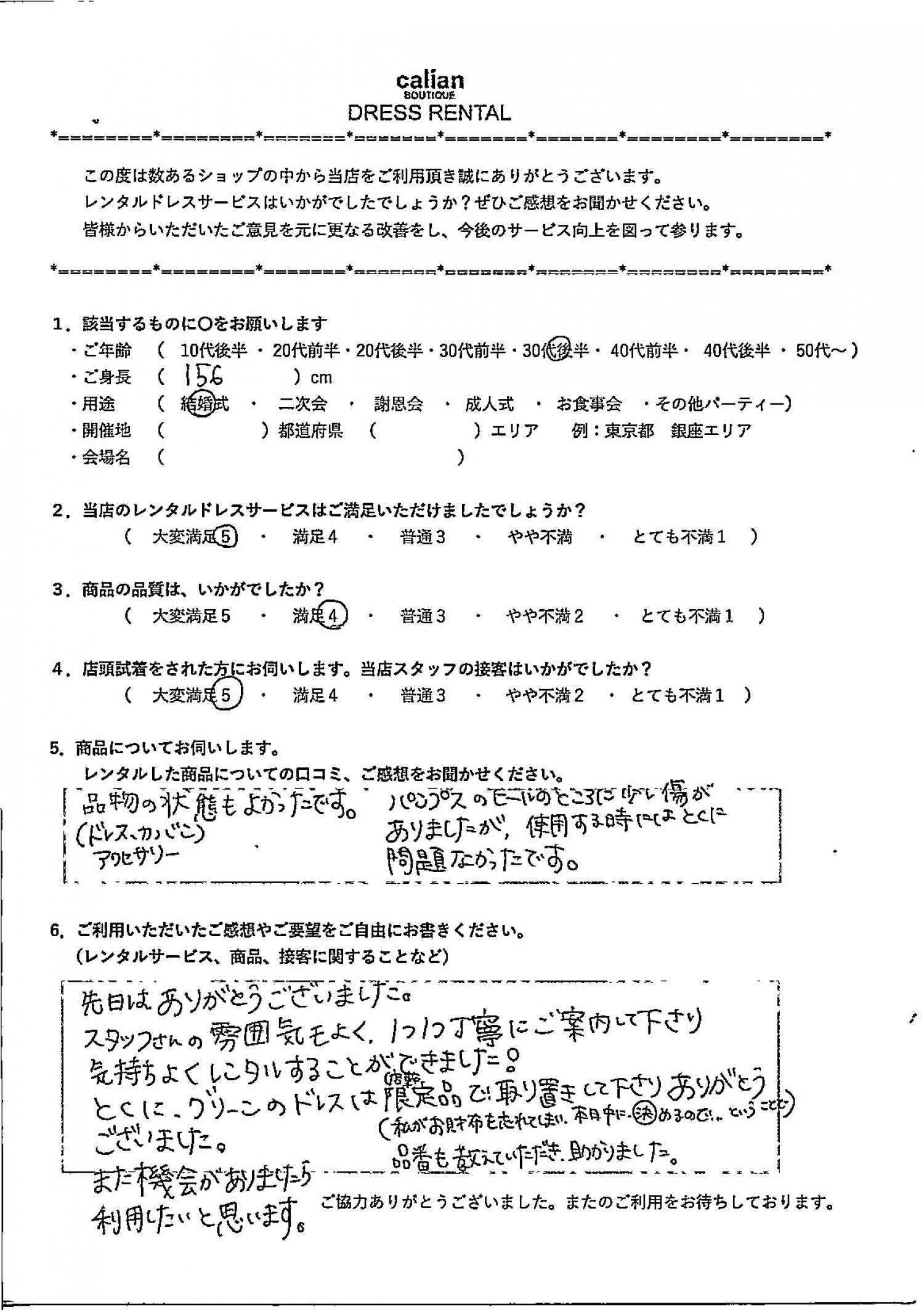 とくにグリーンのドレスは店舗限定品で取り置きしてくださりありがとうございました。(私かお財布を忘れてしまい、本日中に決めるのでということで)品番も教えていただきありがとうございました。また機会がありましたら利用したいと思います。