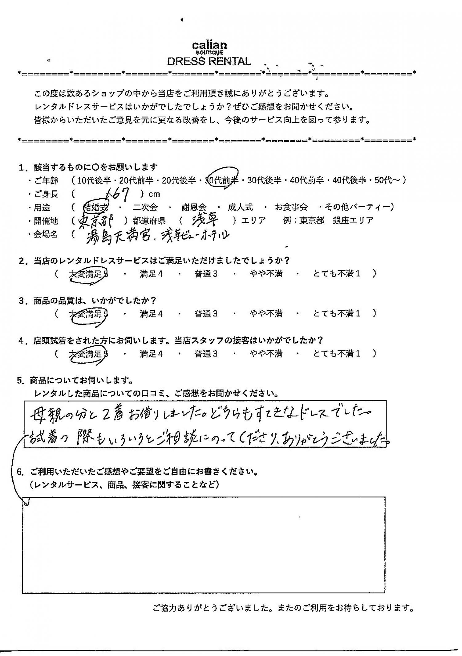母親の分と2着おかりしました。どちらもすてきなドレスでした。試着の際もいろいろとご相談にのってくださり、ありがとうございました。