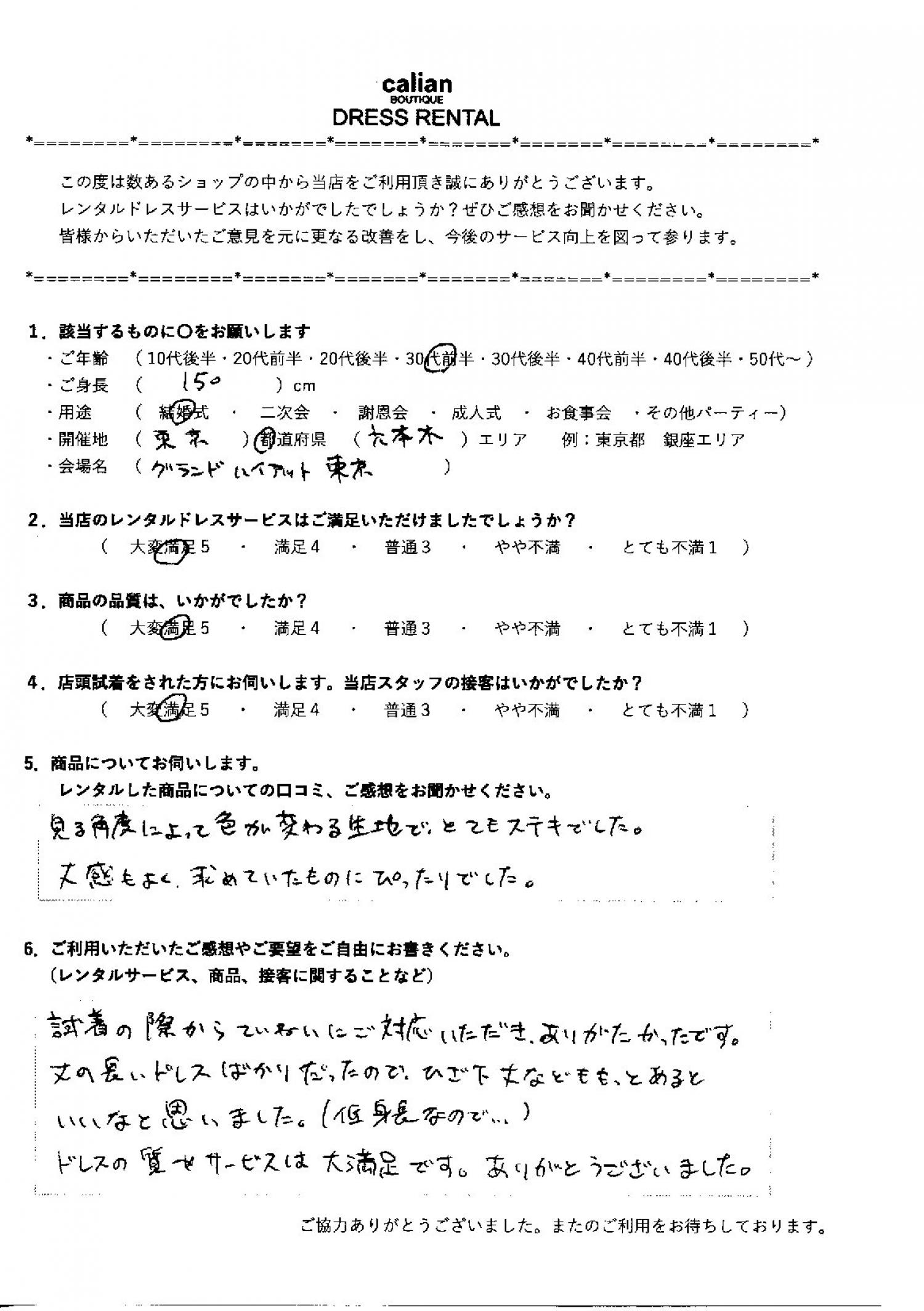 ドレスの質やサービスは大満足です。ありがとうございました。