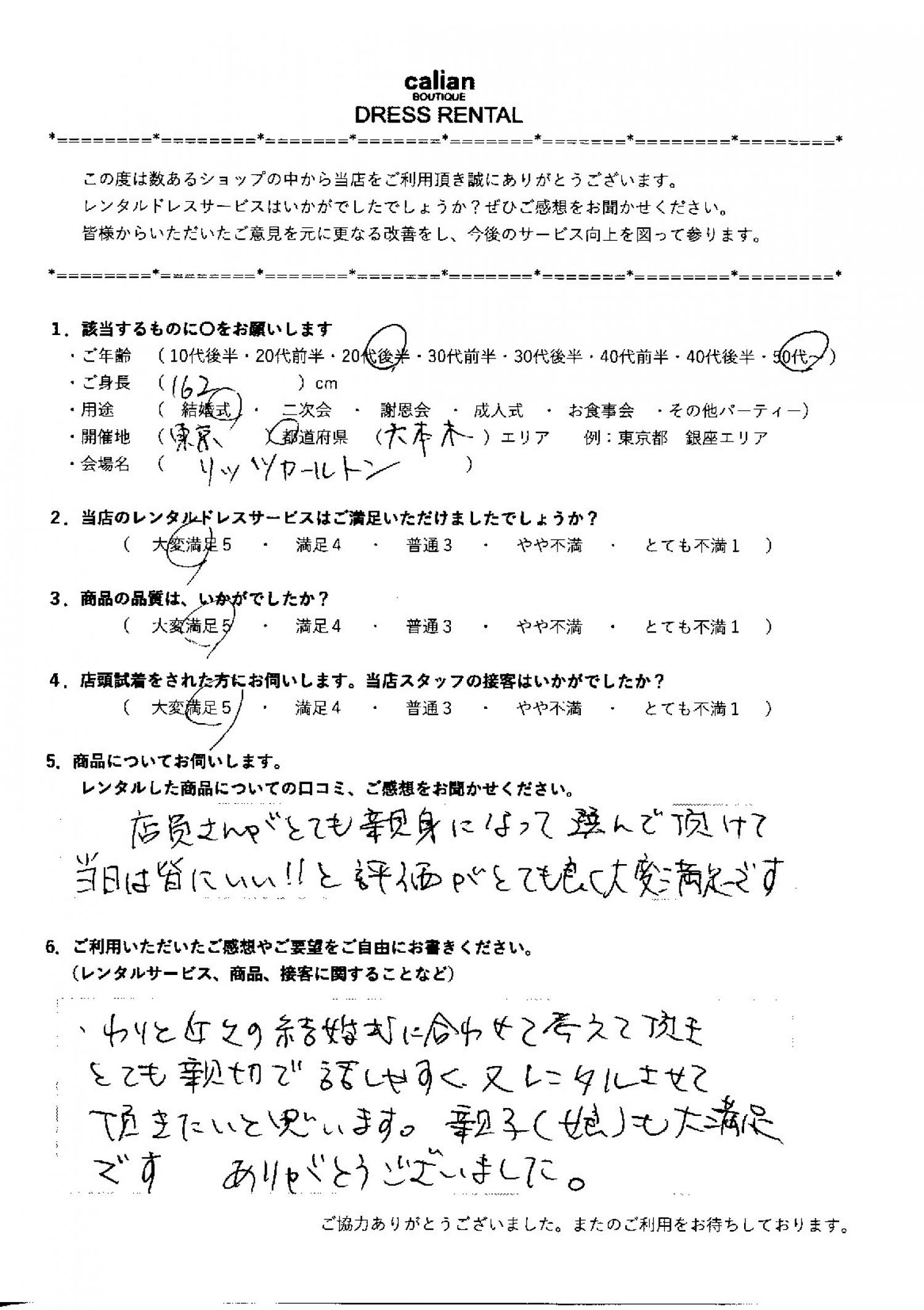 わりと近々の結婚式に合わせて考えていただきとても親切で話しやすく又レンタルさせて頂きたいと思います。親子(娘)も大満足です。ありがとうございました。