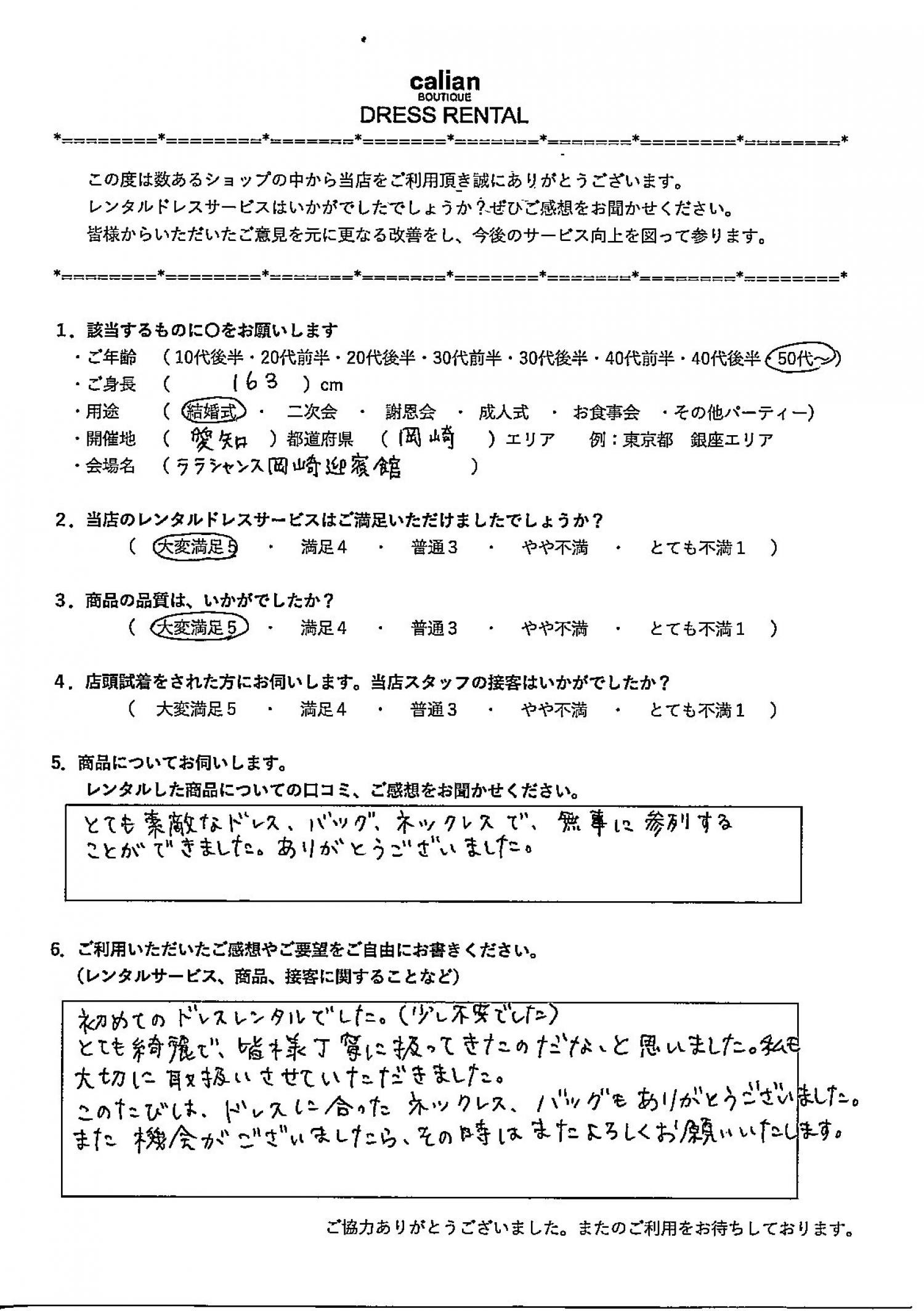とても素敵なドレス、バッグ、ネックレスで、無事に参列することができました。ありがとうございました。