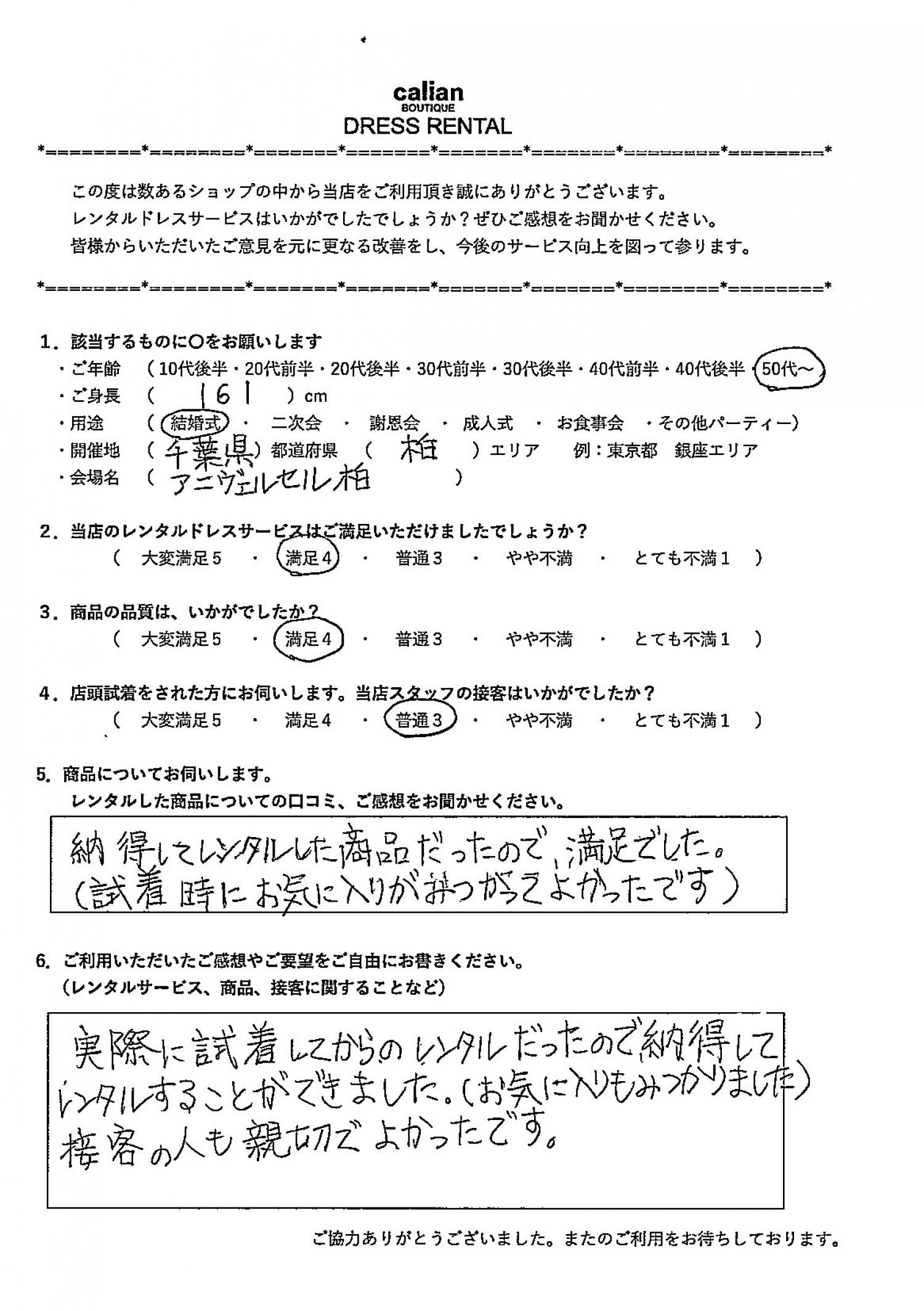 実際に試着してからのレンタルだったので納得してレンタルすることができました。(お気に入りもみつかりました)接客の人も親切で良かったです。