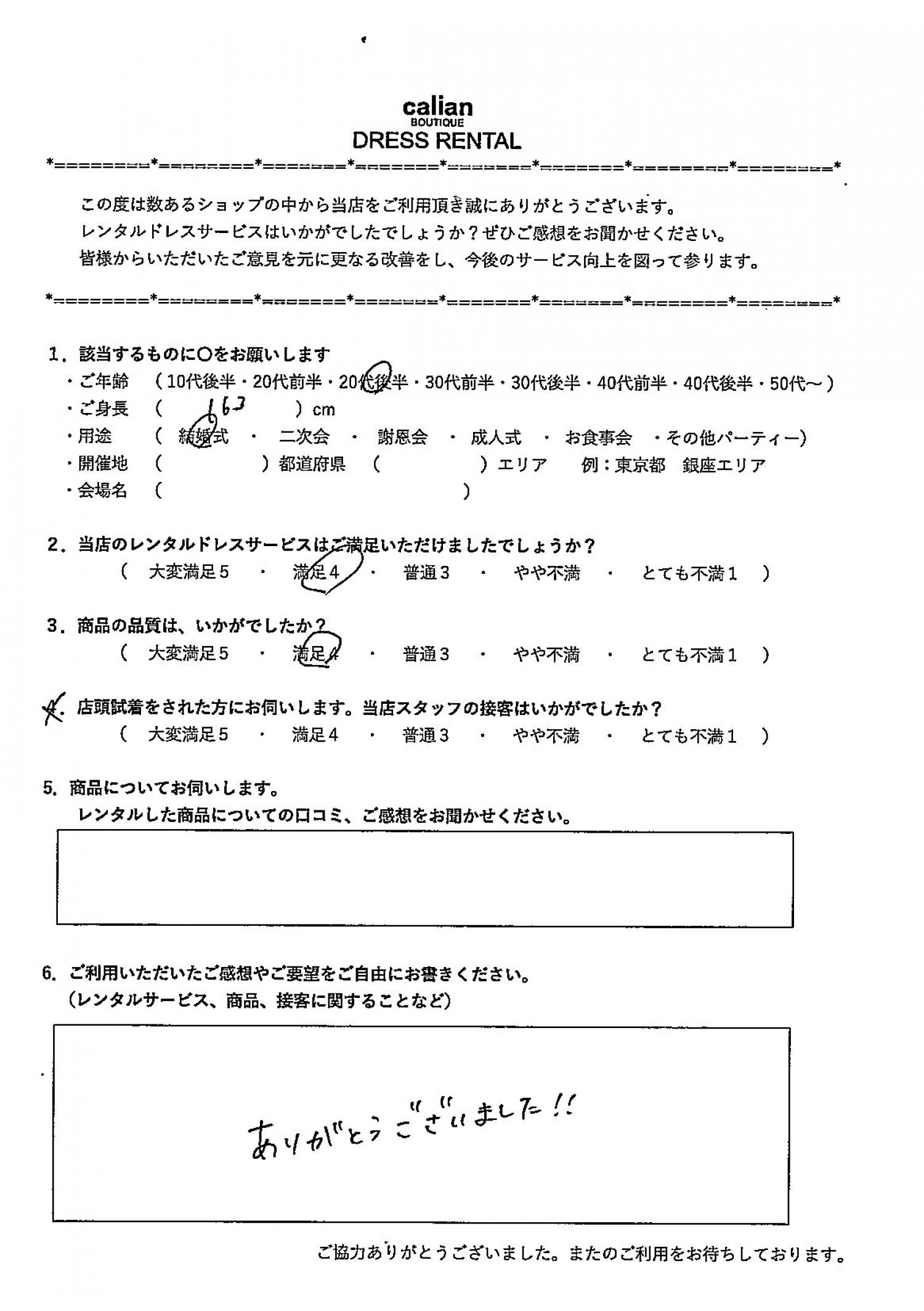 2026/03/15 結婚式利用 4Lサイズ (4点) 利用シーン 結婚式 年代 20代 レンタル情報 ネット注文 レンタルアイテム 単品ドレス その他カテゴリー 大きいサイズ お客様からの声 今回ご利用の商品 ドレス FT201D2045-05 1.該当するものを選択してください ・ご年齢 20代後半・ご身長 163cm・用途 結婚式2.当店のレンタルドレスサービスはご満足いただけましたでしょうか? (4点) 3.商品の品質は、いかがでしたか? (4点) 4.ご利用いただいたご感想やご要望をご自由にお書きください。(レンタルサービス、商品、接客に関することなど) ありがとうございました!!