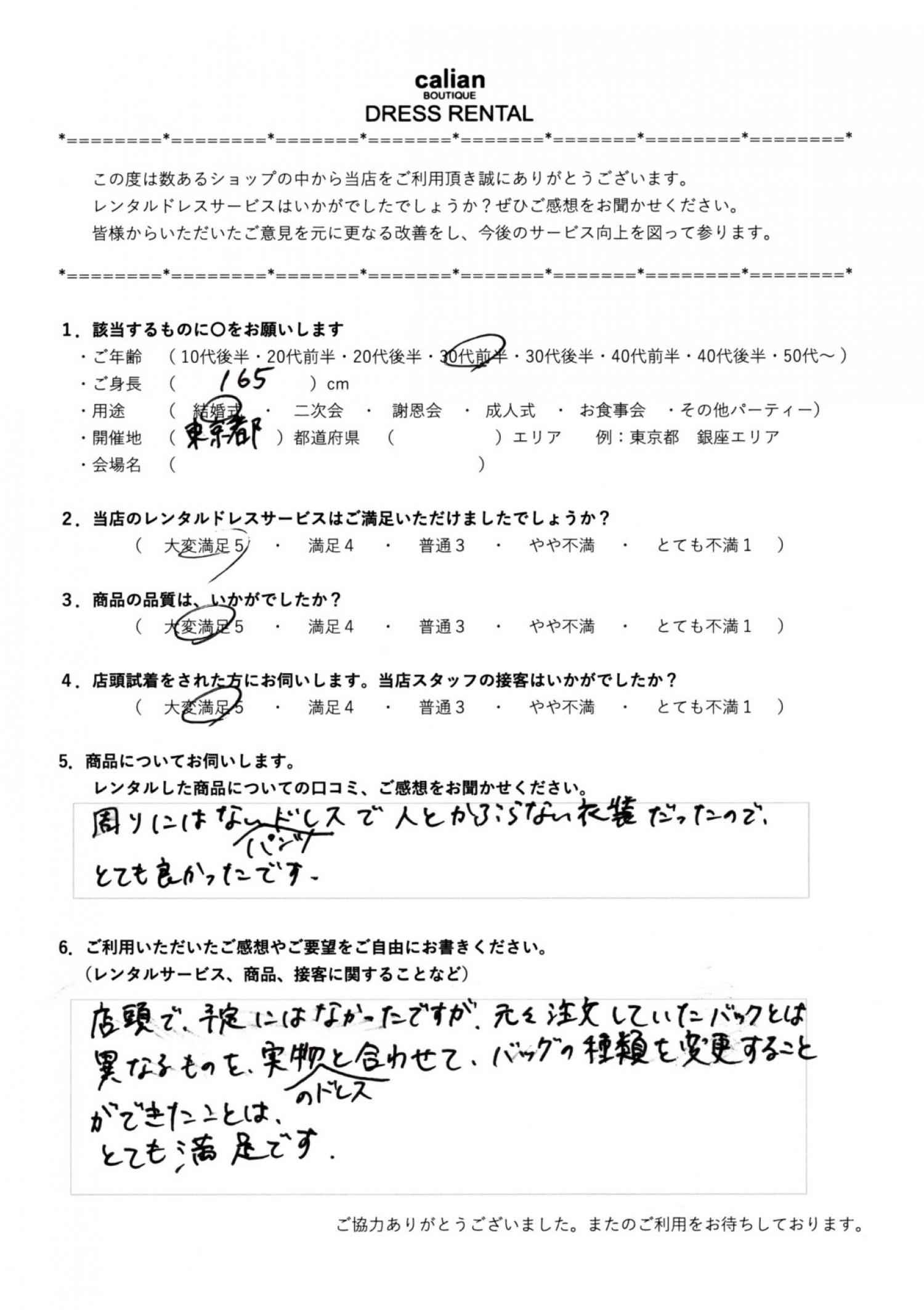 店頭で予定にはなかったですが、元々注文していたバッグとは異なるものを実物のドレスと合わせて、バッグの種類を変更することができたことは、とても満足です。