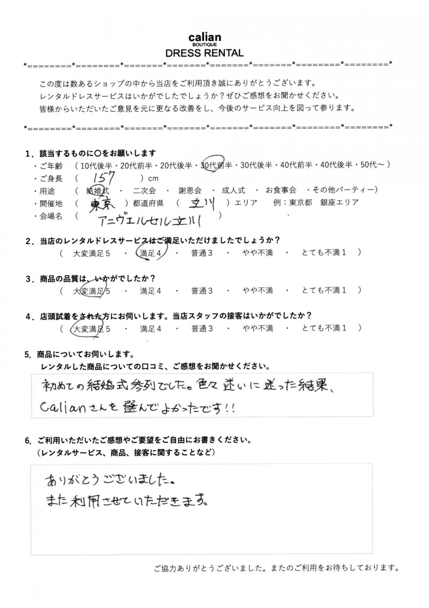初めての結婚式参列でした。色々迷いに迷った結果、Calianさんを選んでよかったです!!