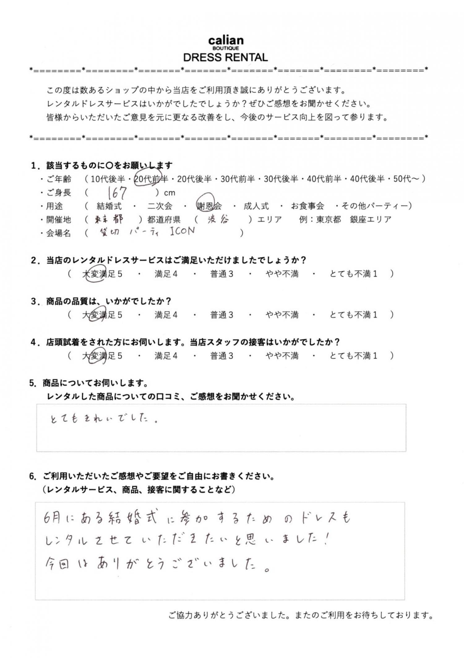 6月にある結婚式に参加するためのドレスもレンタルさせていただきたいと思いました!今回はありがとうございました。