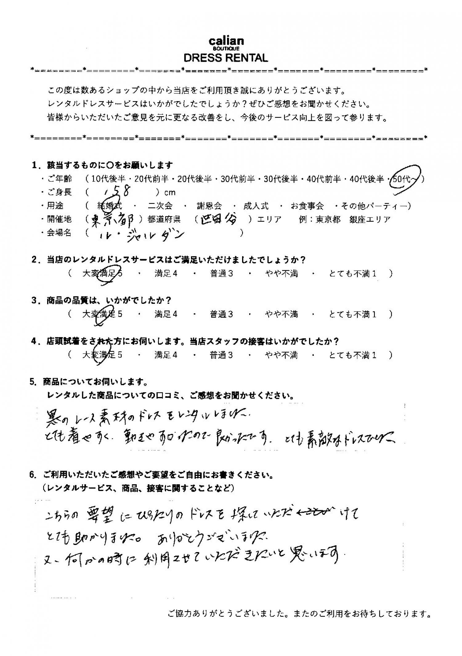 こちらの要望にぴったりのドレスを探していただけてとても助かりました。ありがとうございました。