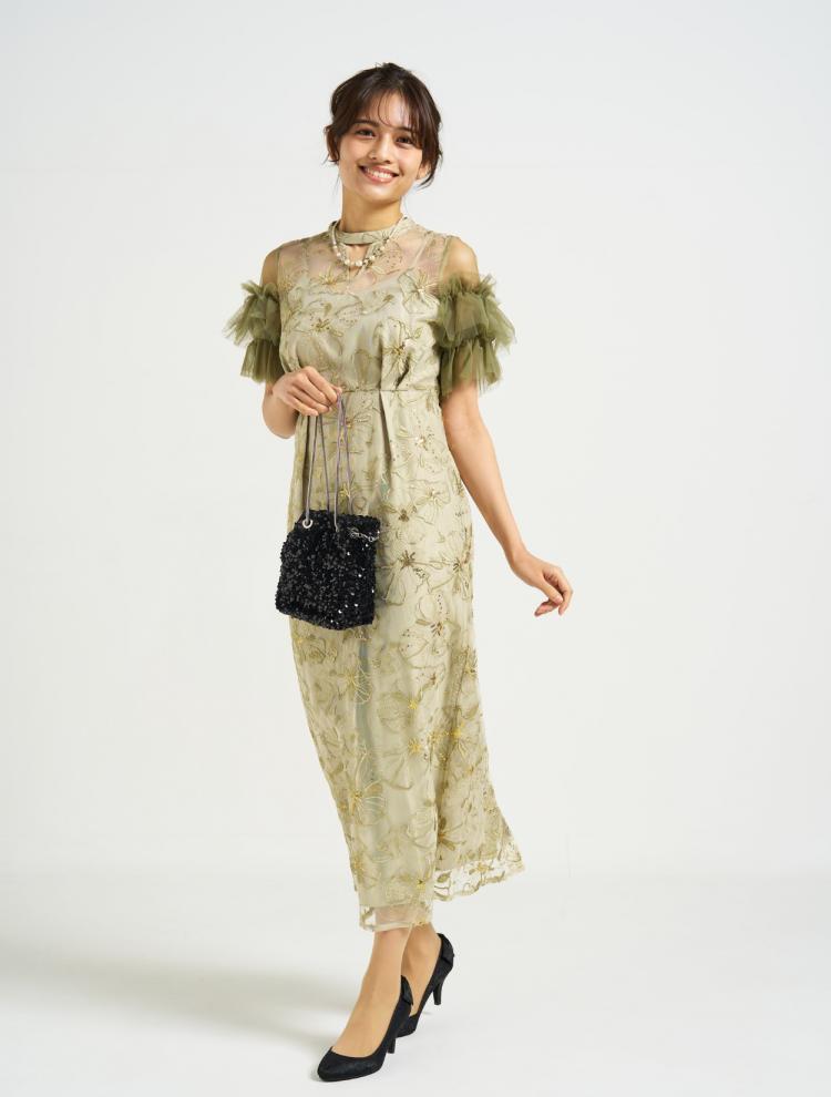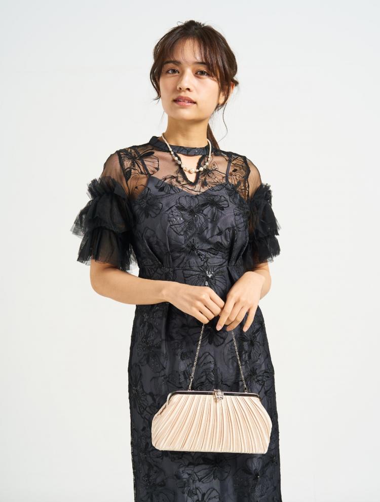 長めの袖丈のドレスには、袖のデザインがレースやシフォンなど透け感のあるものがおすすめ。気になる二の腕周りを隠しつつ、華やかに着こなせます。