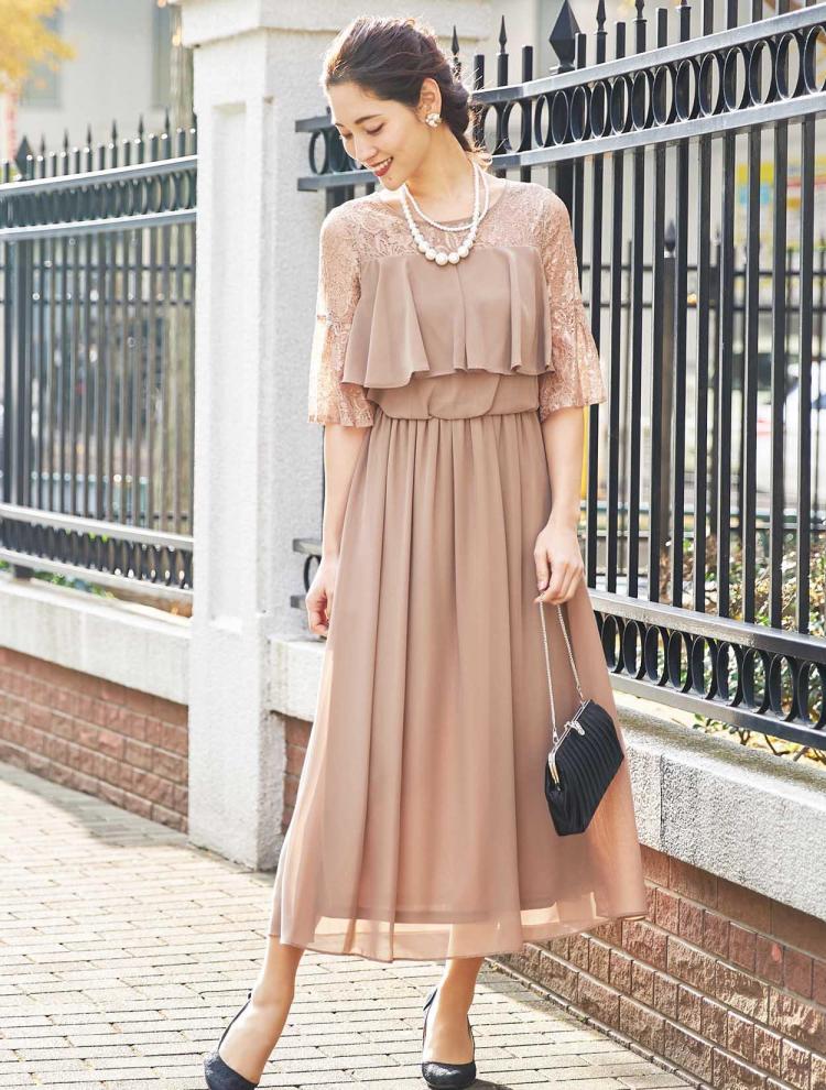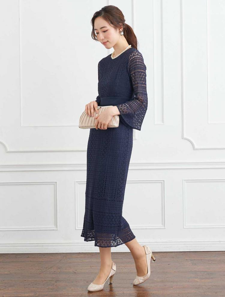 ネイビーのドレスにベージュのバッグとパンプス。柔らかく華やかな印象に。
