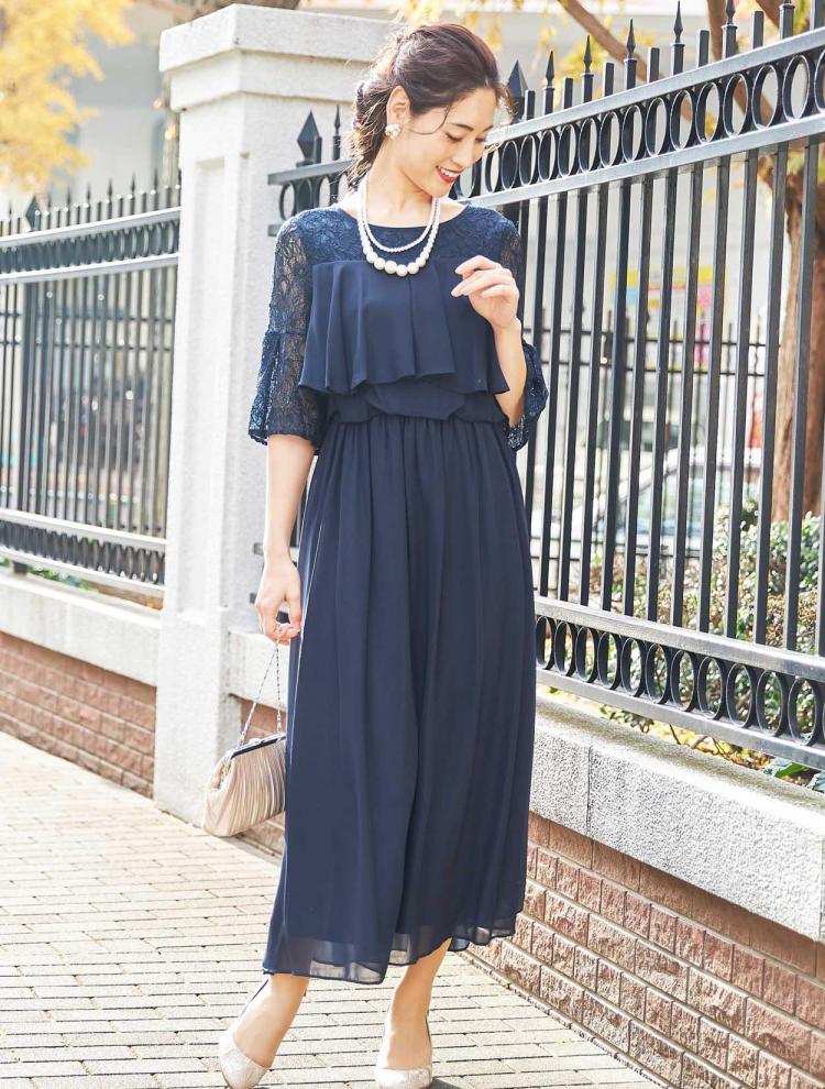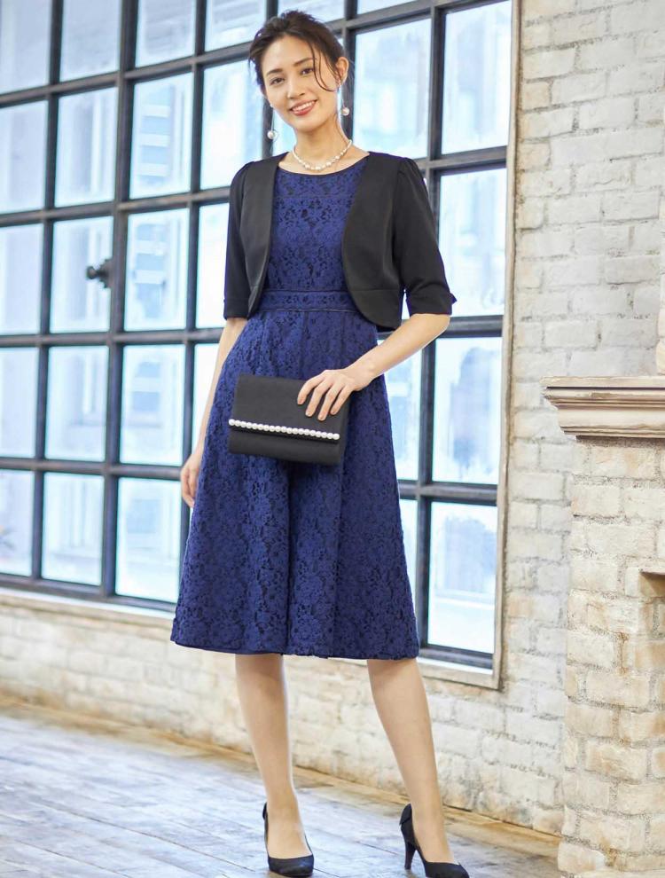 ネイビーのドレスにブラックのバッグとパンプス。落ち着き控えめな印象に。