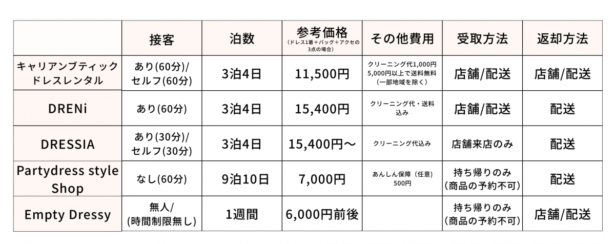 次に、レンタルサービスの内容を比較してみます。価格については、現在主流の袖付きドレス+小物2点(パーティーバッグ+アクセサリー)の3点の価格で比較してみました。